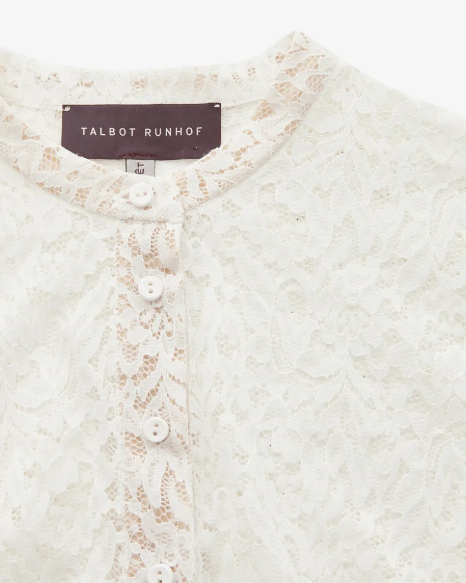 Dirndlbluse semi-transparent für Damen von Talbot Runhof in Weiß. Das Modellüberzeugt dank semi-transparenter Spitzen-Verarbeitung in femininer Aufmachung, während die ¾-Ärmelund der schmale Stehkragen den Trachten-Look mit romantischer Note vollenden.