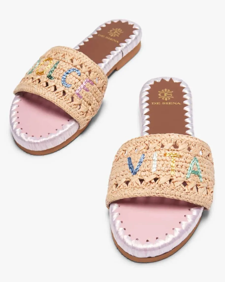 Dolce Vita Pantoletten für Damen von De Siena in Natur, Rosa und Braun. Dank dermodischen Bast-Aufmachung besticht das Modell als sommerlicher Favorit, währendder gestickte Schriftzug dem Gesamtbild den letzten Schliff verleiht.
