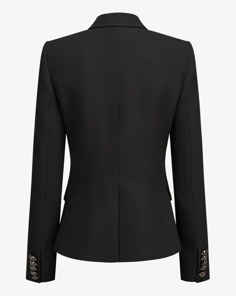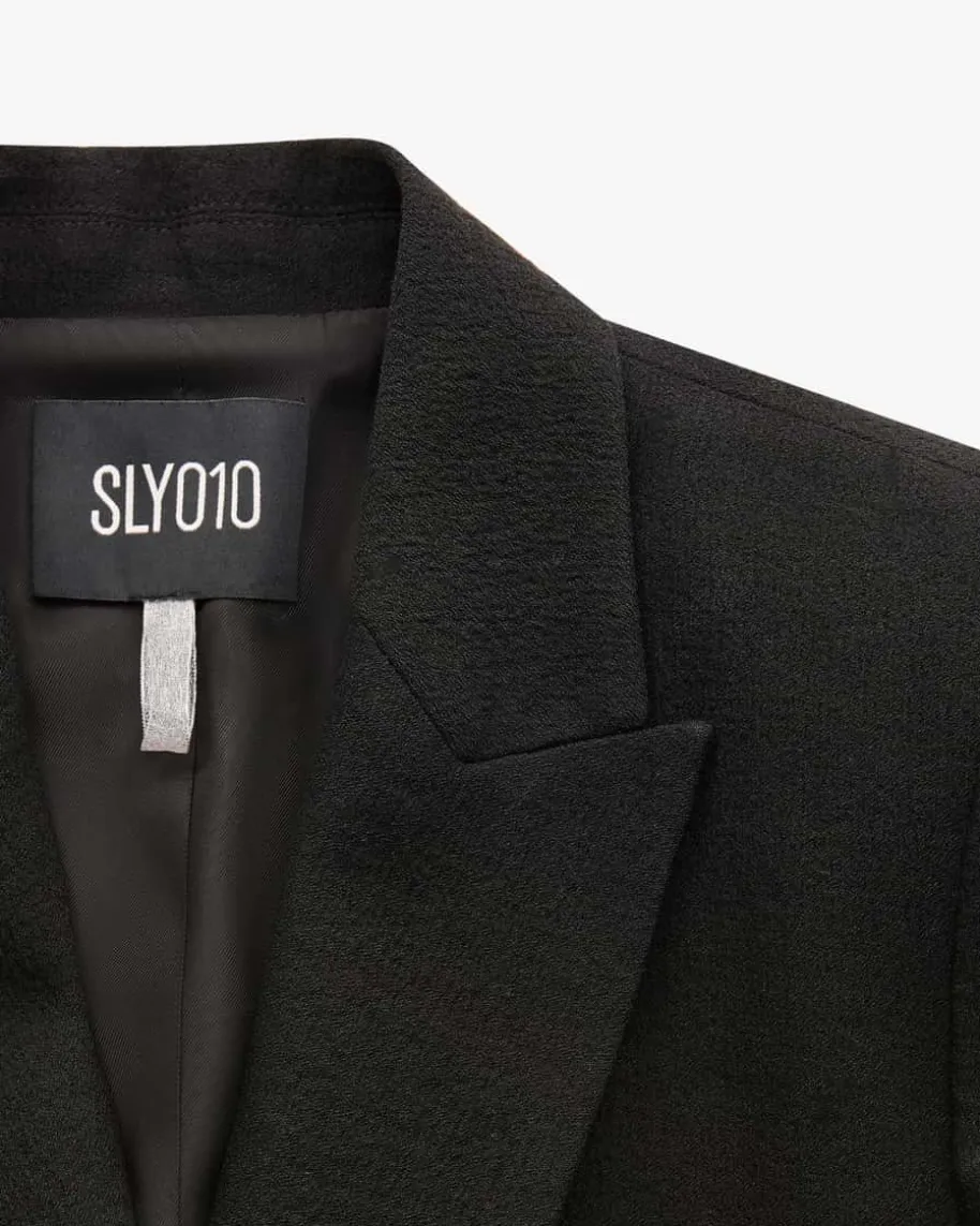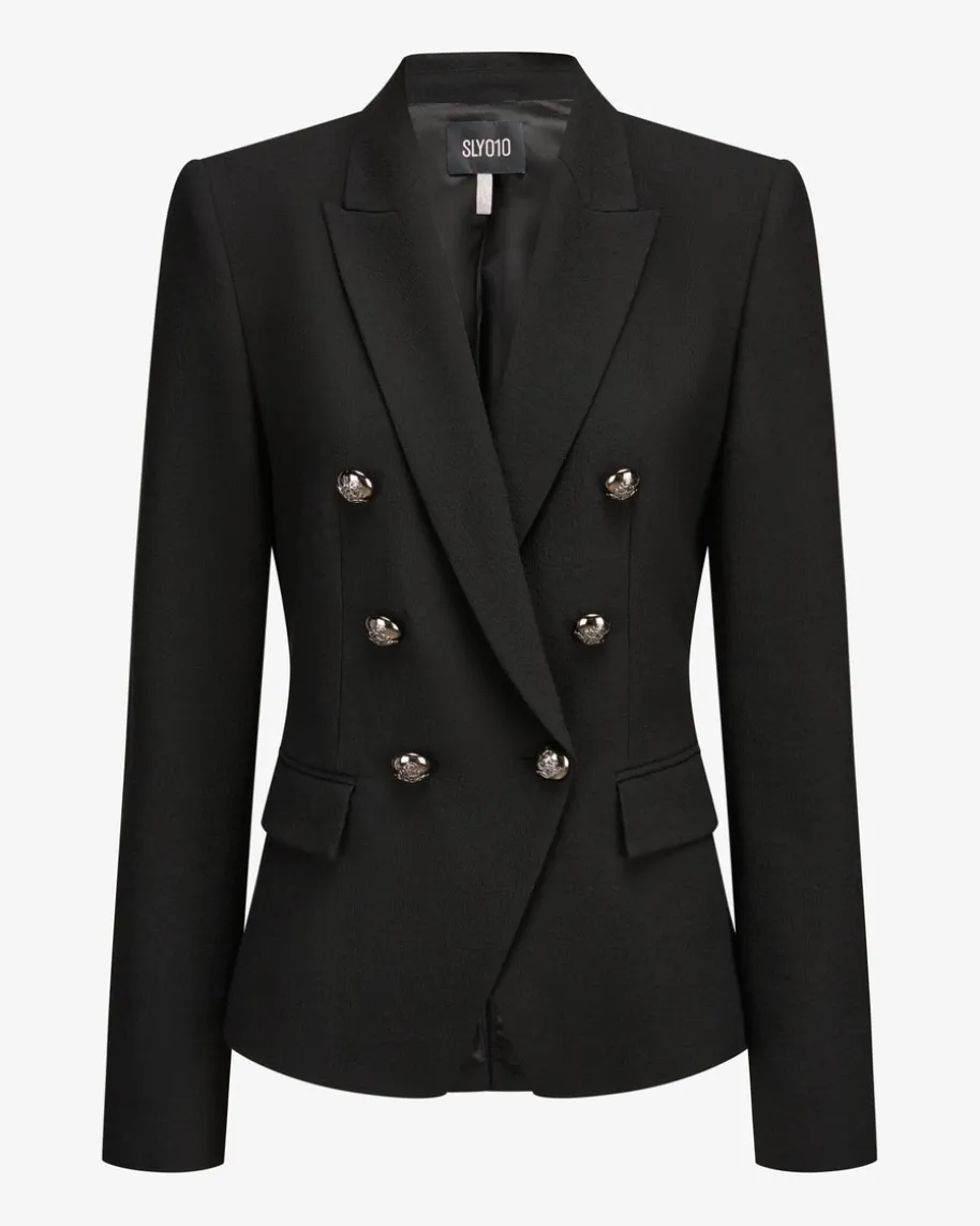 Doppelreiher-Blazer für Damen von SLY010 in Schwarz. Mitdiesem Modell präsentiert das Labeleinen modischen Favoriten mit Reverskragen und logo-geprägten Knöpfen, währenddie feminine Silhouette und das matte Crêpe-Material eineneleganten Begleiterfür ihre Garderobe zaubert.