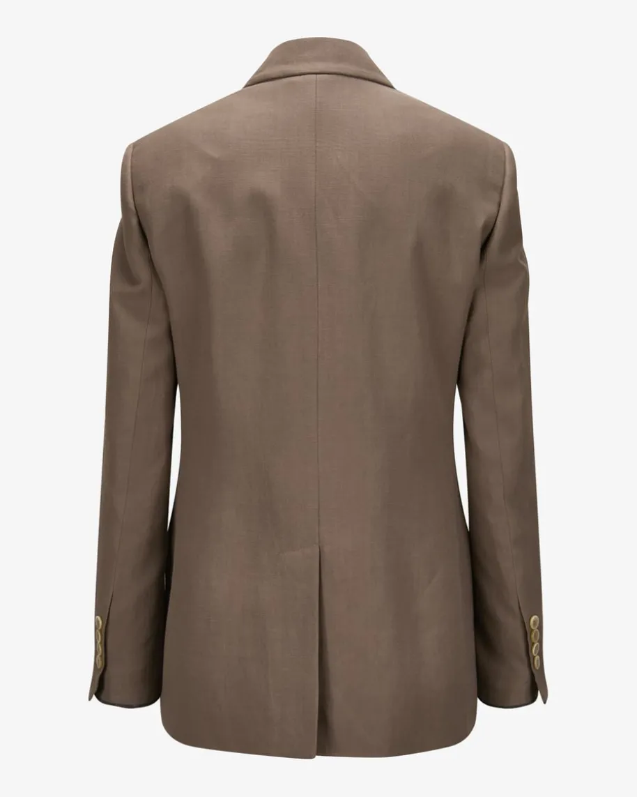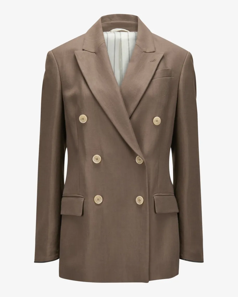 Doppelreiher-Blazer für Damen von Brunello Cucinelli inBraun. Das zweireihige Modellavanciert dank der dezenten Ketten-Applikationen und spitzemReverskragen zumFavoriten für stilvolle Outfits, während klassische Detailseinen zeitlos-eleganten Look kreieren. Der hochwertige Viskose-Leinen-Mixsorgt für angenehmenTragekomfort und rundet den Style gekonnt ab.