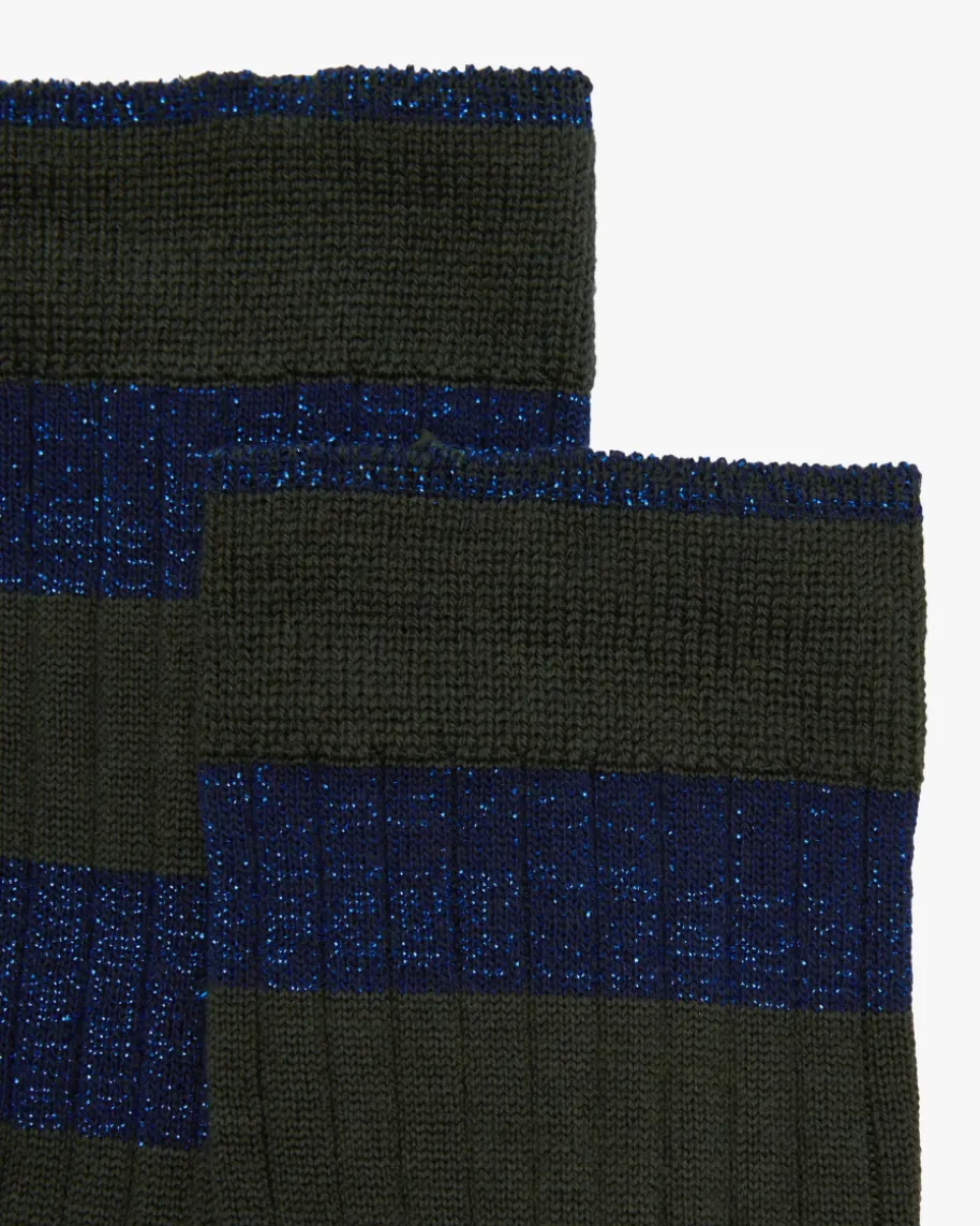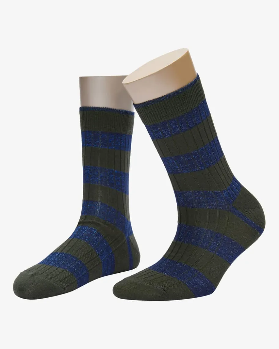 Elodie Strümpfe für Damen von Alto in Oliv und Dunkelblau. Made in Italy – 1923gegründet, zeichnet das Unternehmen die Verbindung von Tradition und Exzellenzaus. Die Socke ist nicht nur ein Modeaccessoire, sondern interpretiert den Stilund die Persönlichkeit des Trägers. Auch dieses Modell mit Rippstrick-Elementenbegeistert dank changierenden Glitzerfasern und Blockstreifenmuster in modischerAufmachung.