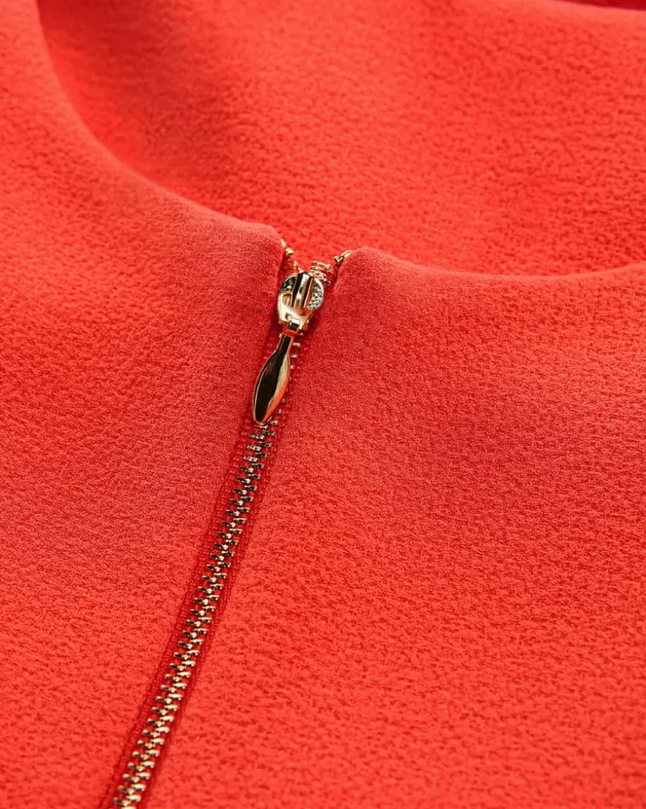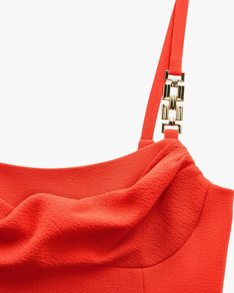 Empress Cocktailkleid für Damen von Rebecca Vallance in Orange. Während diefigurbetonte Etuikleid-Silhouette in Crêpe-Aufmachung einen abendlichenFavoriten mit femininem Charme kreiert, lassen der drapierte Wasserfall-Ausschnitt sowie die goldfarbenen Metall-Elemente das Gesamtbild zum besonderenBlickfang avancieren.