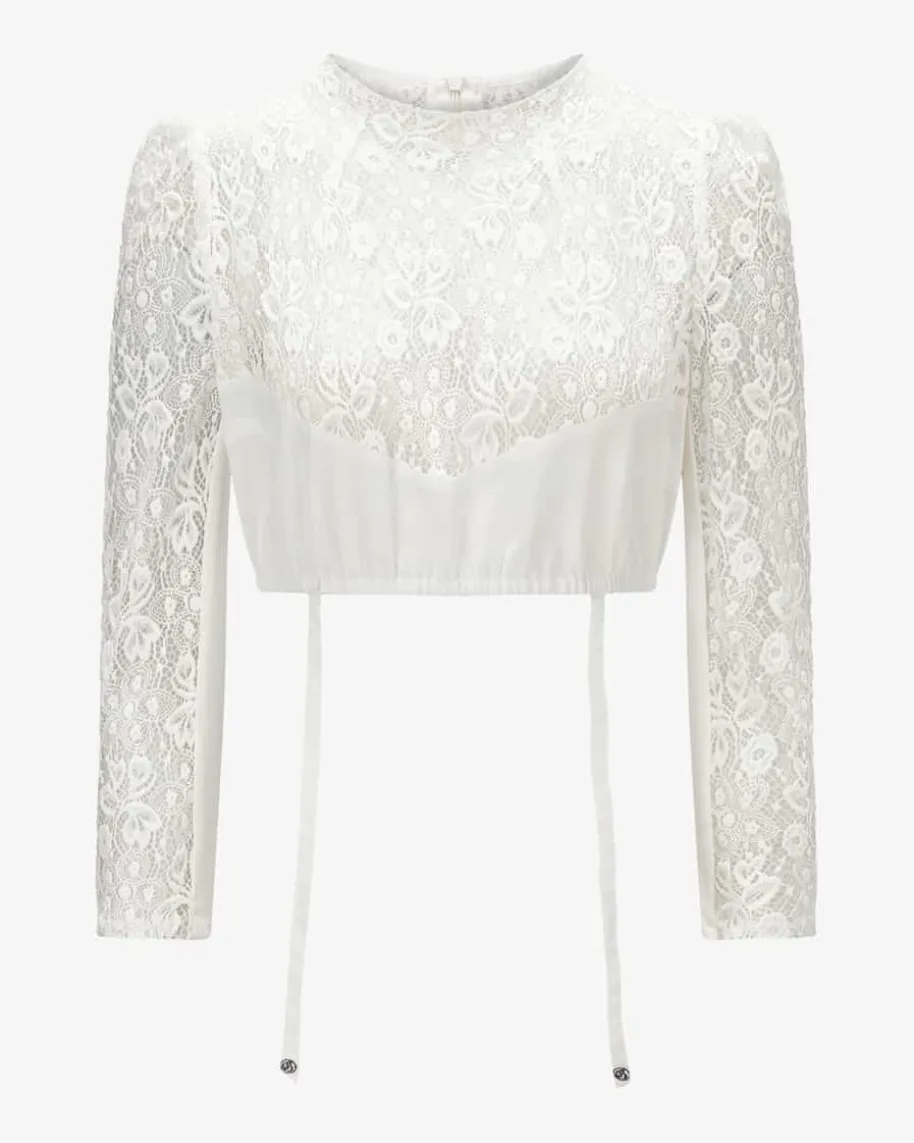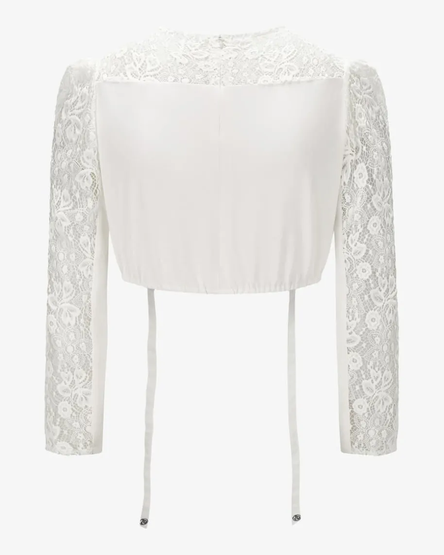 Ernesta Dirndlbluse für Damen von Gottseidank in Weiß. Das hochgeschlosseneModell besticht durch den charmanten Material-Mix aus floraler Spitze sowieangenehmer, elastischer Rückseite in stilvoller Aufmachung und avanciert so zumfemininen Dirndlbegleiter.
