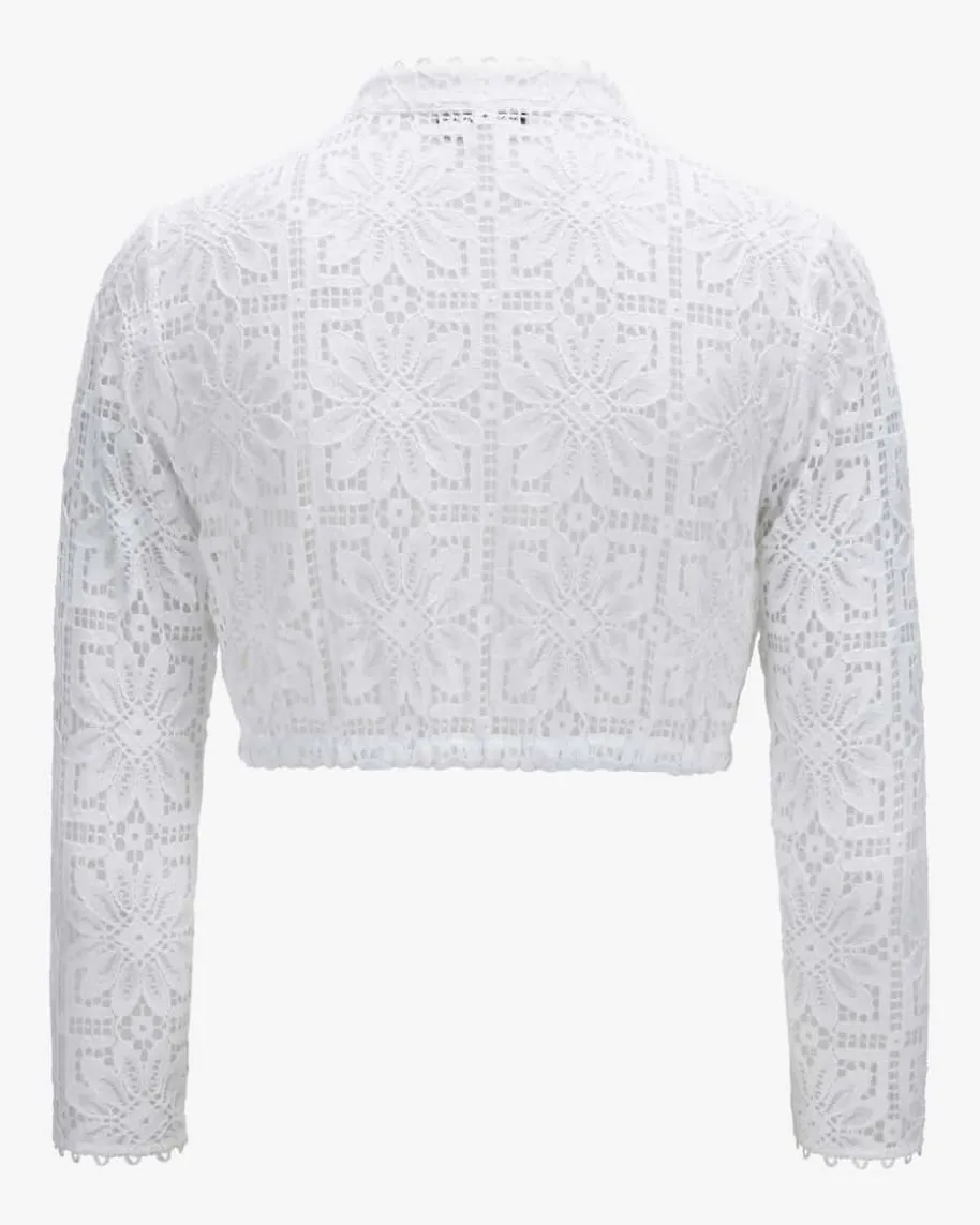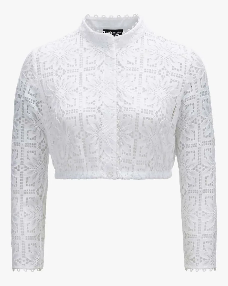 Evelyn Dirndlbluse für Damen von Kinga Mathe in Weiß. Das semi- transparenteModell präsentiert sich dank der floralen Spitze als romantischer Begleiter fürIhren Trachten-Look, während der dezente Stehkragen einen modischen Hinguckerkreiert.