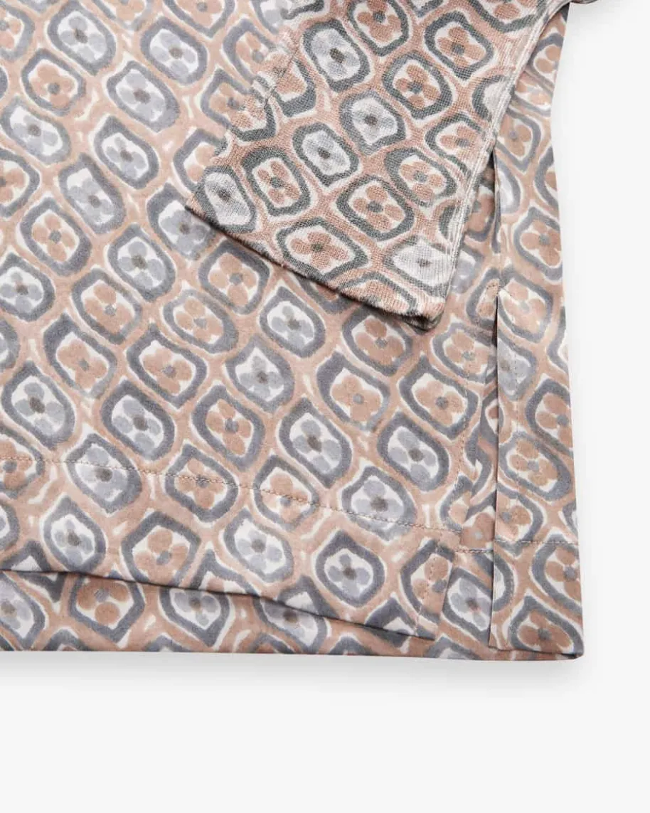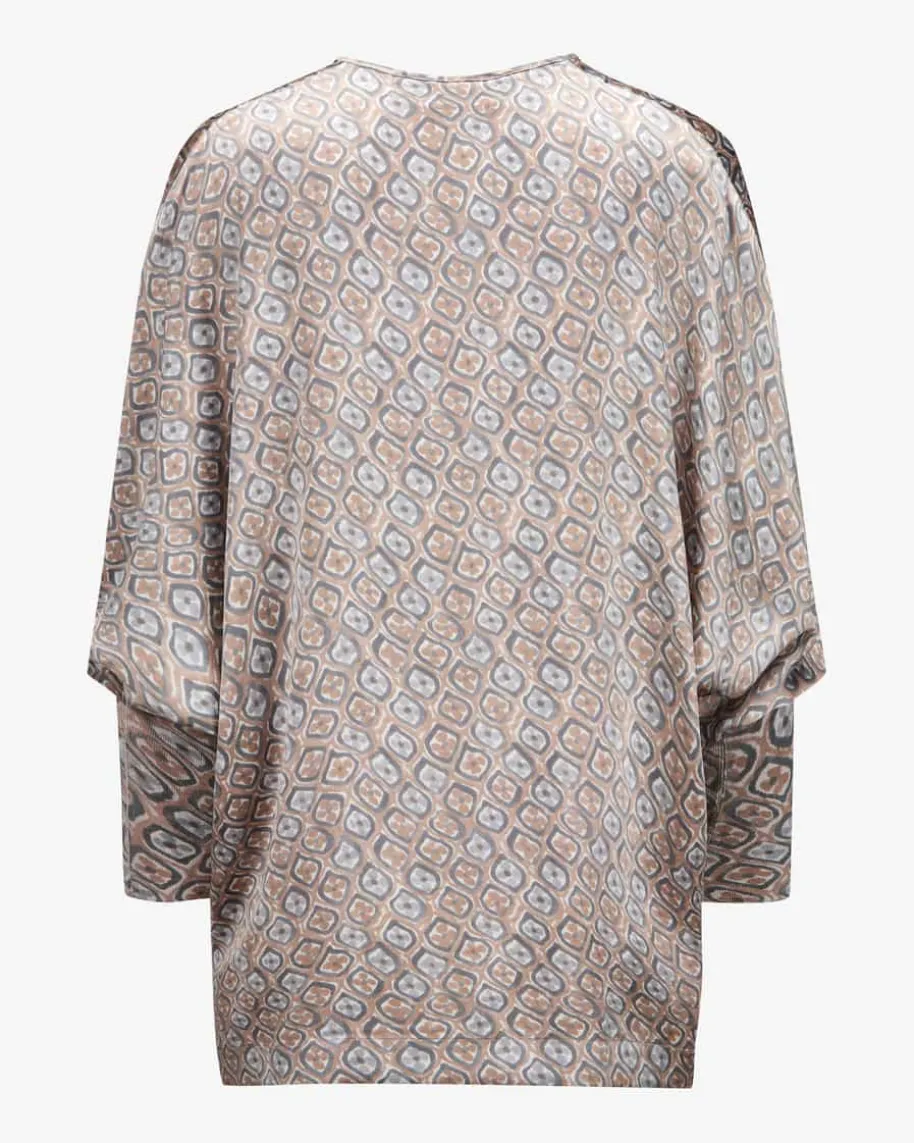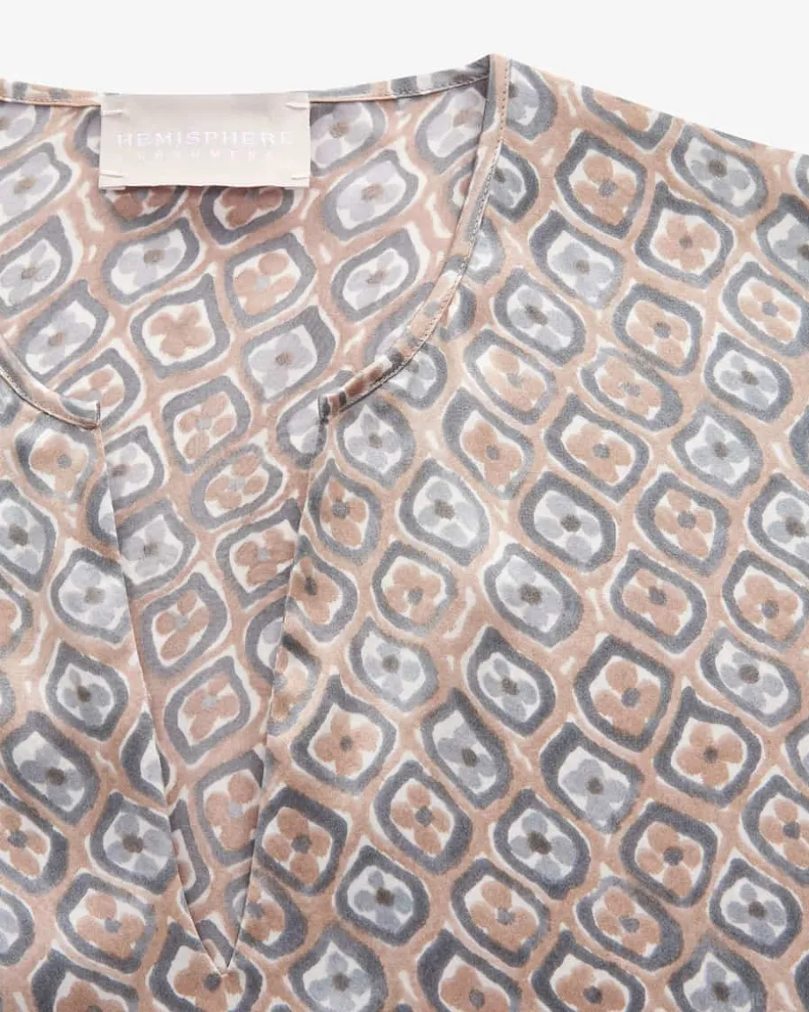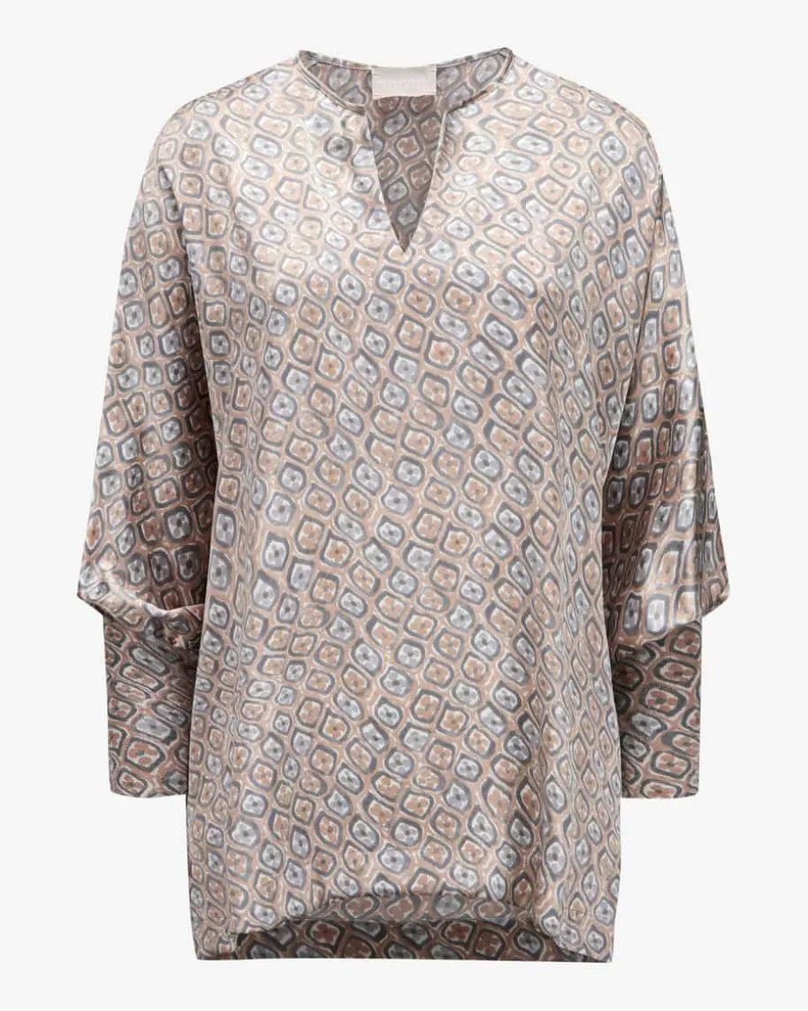 Farata Seiden-Tunika für Damen von Hemisphere in Stahlgrau, Beige und Weiß. Diedeutsche Marke steht für luxuriöse Strick- und Kaschmirteile mit Fokus aufQualität, Weichheit und zeitlose Farben. Auch dieses Modell in hochwertigerSeiden-Qualität überzeugt in elastischer Aufmachung, welche für angenehmeTragemomente sorgt, während das Allover-Dessin einen besonderen Begleiter füredle Looks kreiert. In Kombination mit dem passenden Rock schaffen sie einenfemininen Allover-Look.