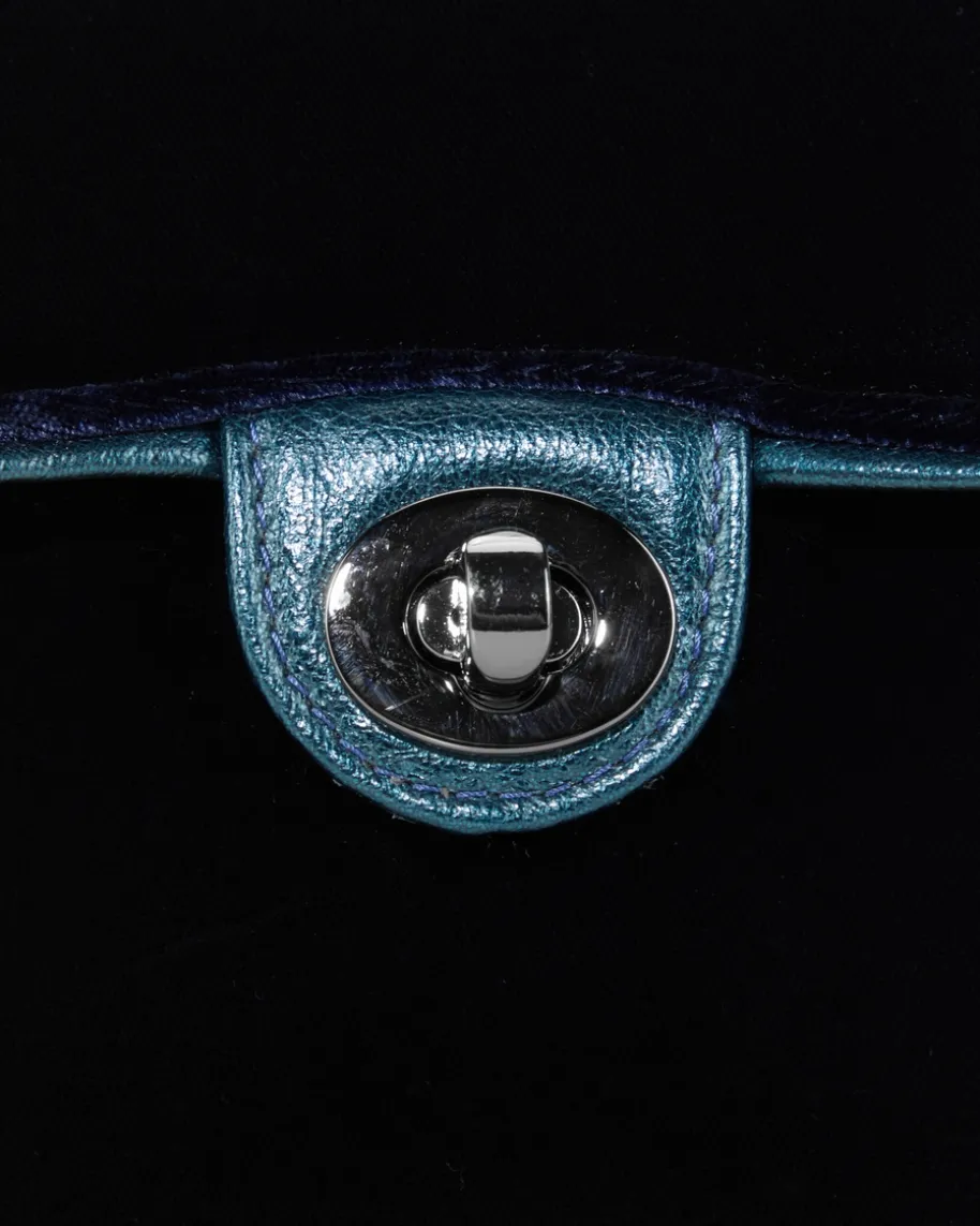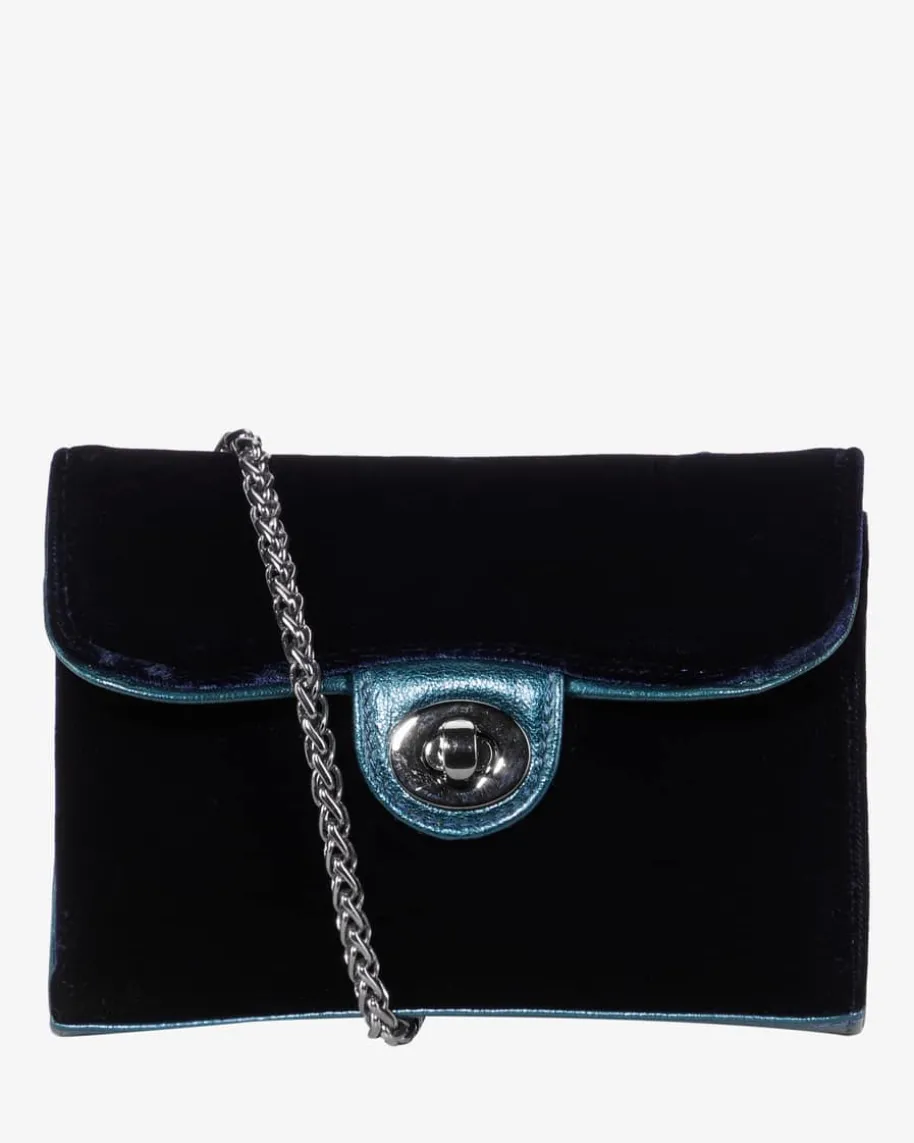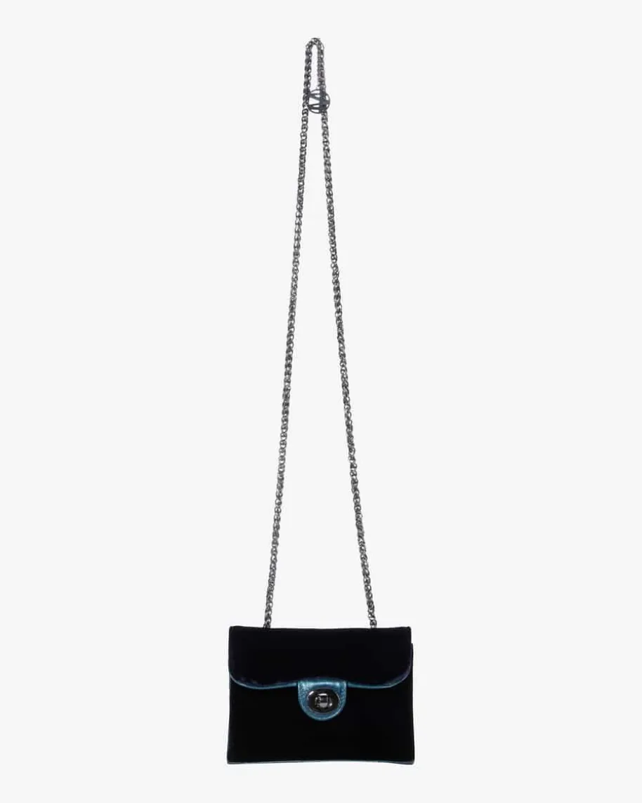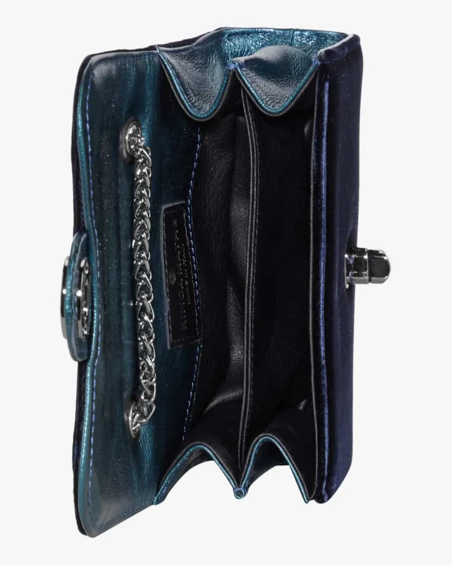 Fiona Trachten-Umhängetasche für Damen von Kinga Mathe in Nachtblau. Das Modellbesticht durch die Kombination aus edler Samt-Optik sowie hochwertiger Leder-Qualität in stilvoller Aufmachung, während die raffinierte Gliederkette dastraditionelle Trachten-Accessoire gekonnt abrundet.