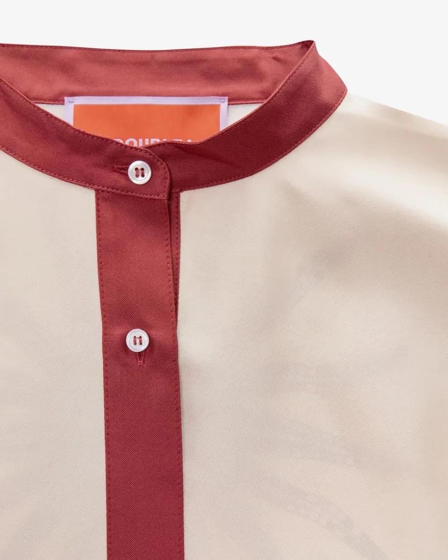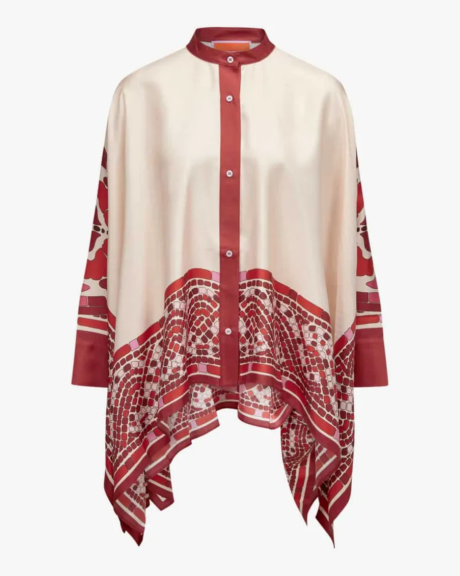 Foulard Seidenbluse für Damen von La DoubleJ in Rot, Creme und Rosa. Das Modellbegeistert mit extravagantem Foulard-Look und kreativem Mosaik-Print aufluxuriöser Seide. Die weite Oversize-Passform mit Blusen-Details und rundet denmodischen Sommer-Style harmonisch ab.