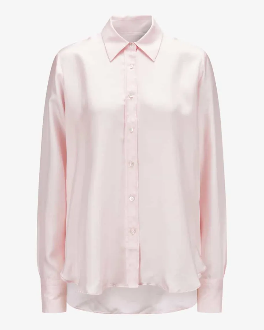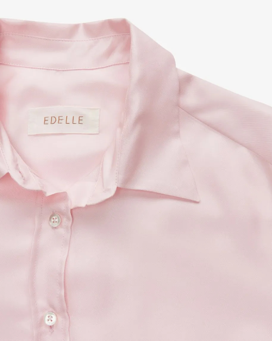 Gilda Seiden-Hemdbluse für Damen von Edelle in Rosé. Das Modell in changierenderSeiden-Twill-Qualität besticht dank der klassischen Passform mit dezentverlängerter Rückseite als modischer und luxuriöser Favorit – ein stilvollerBegleiter für elegante Looks.