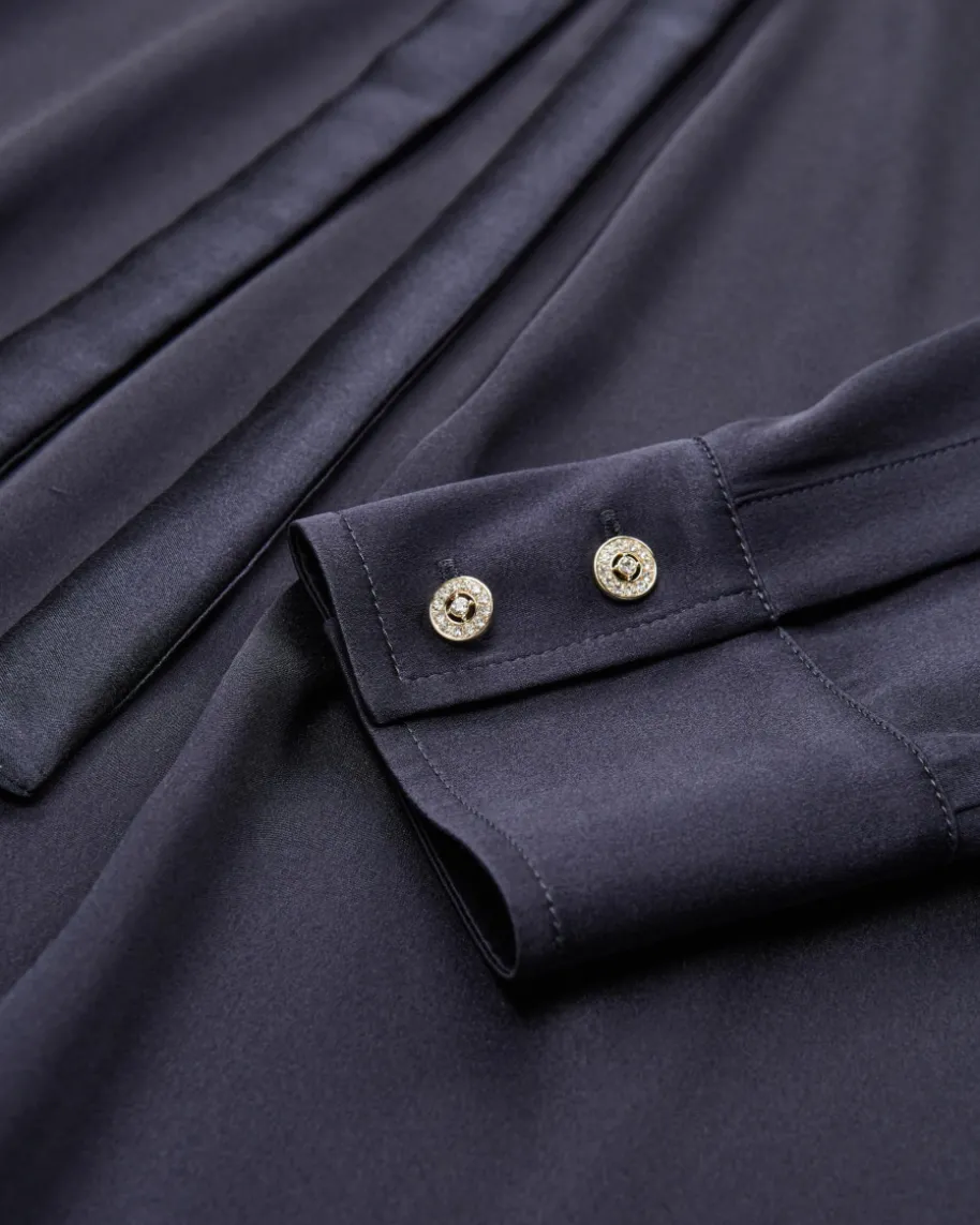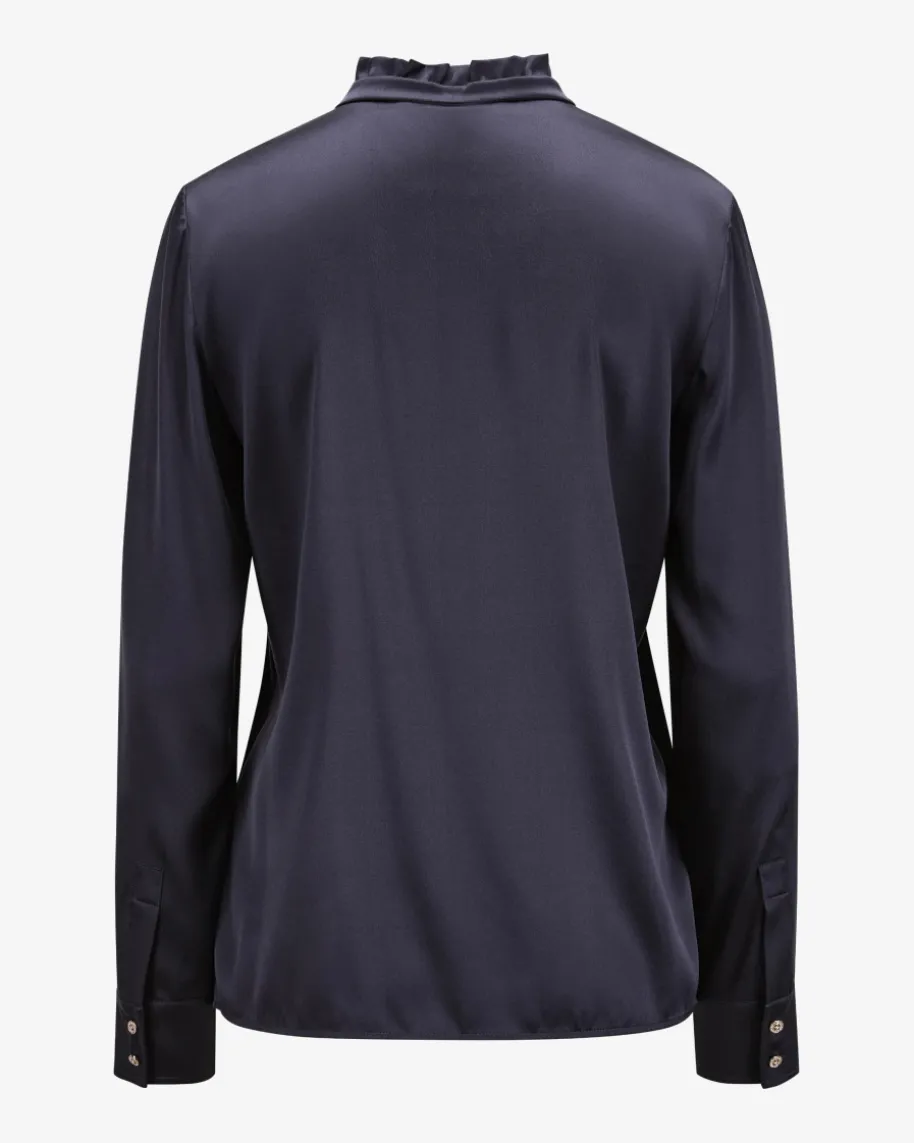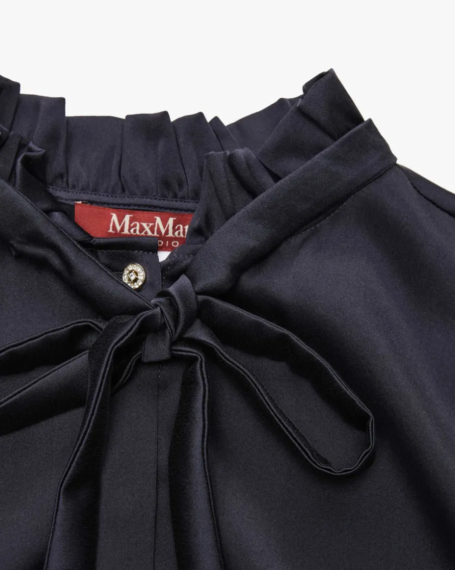 Gilles Seidenbluse für Damen von Max Mara Studio in Navy. Weiblich, modern,tragbar – Max Maras femininere Linie. Auch dieses Modell in leichter Seiden-Qualität überzeugt mit weicher Silhouette, welche sich perfekt für Alltag undOffice stylen lässt. Das changierende Design rundet das Gesamtbild gekonnt ab.