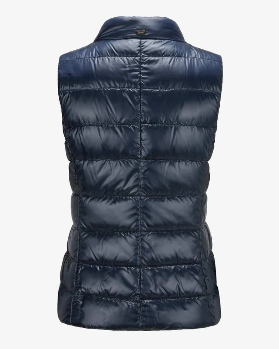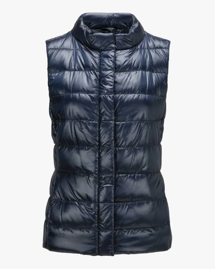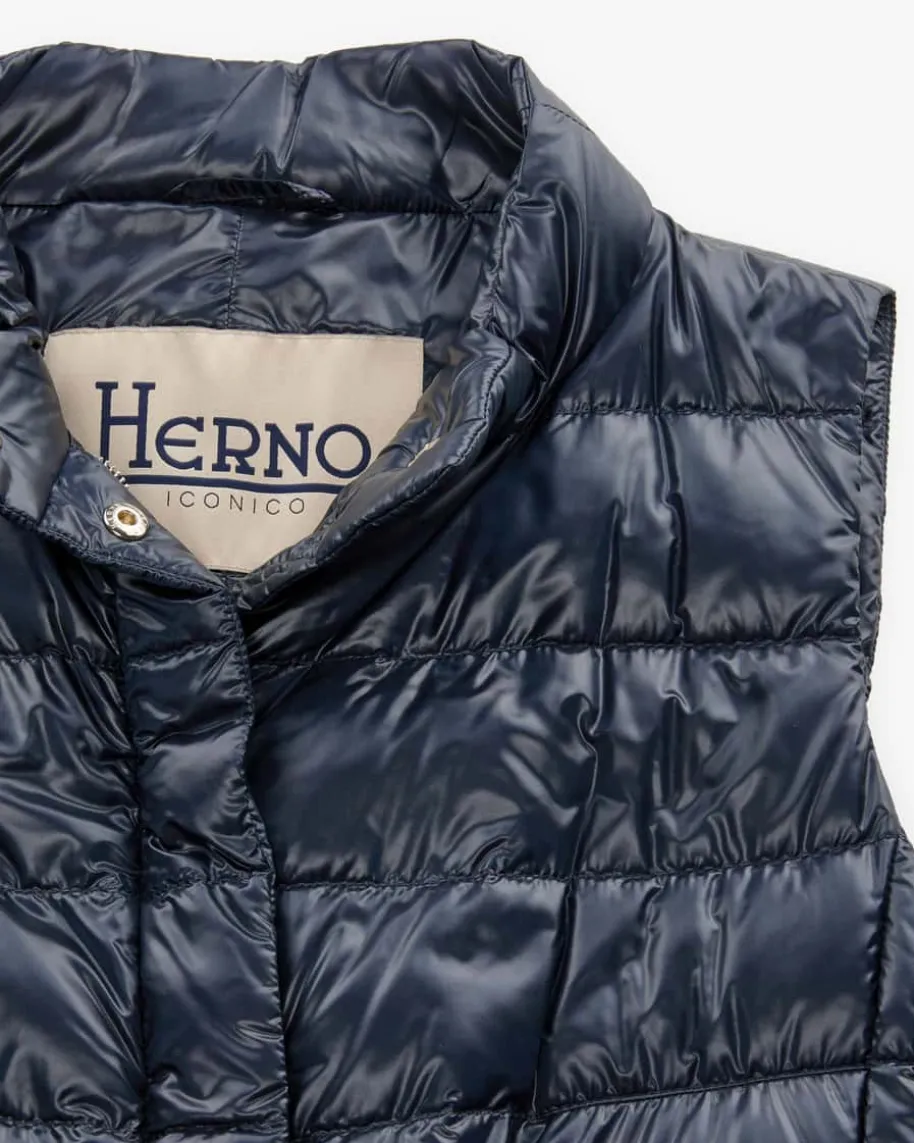 Giulia Daunenweste für Damen von Herno in Navy. Das italienische Premium Labelist seit Jahren bekannt für seine besonders leichten Daunenjacken, die mitzeitlos-sportiven Designs überzeugen. Auch dieses Modell überzeugt durch seinebesonders leichte Material-Verarbeitung in changierender Stepp-Optik, währenddie taillierte Passform Ihre Figur feminin in Szene setzt.