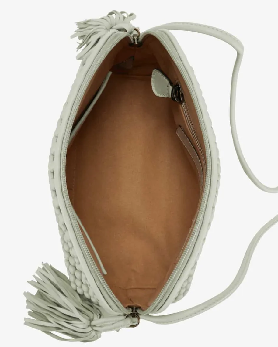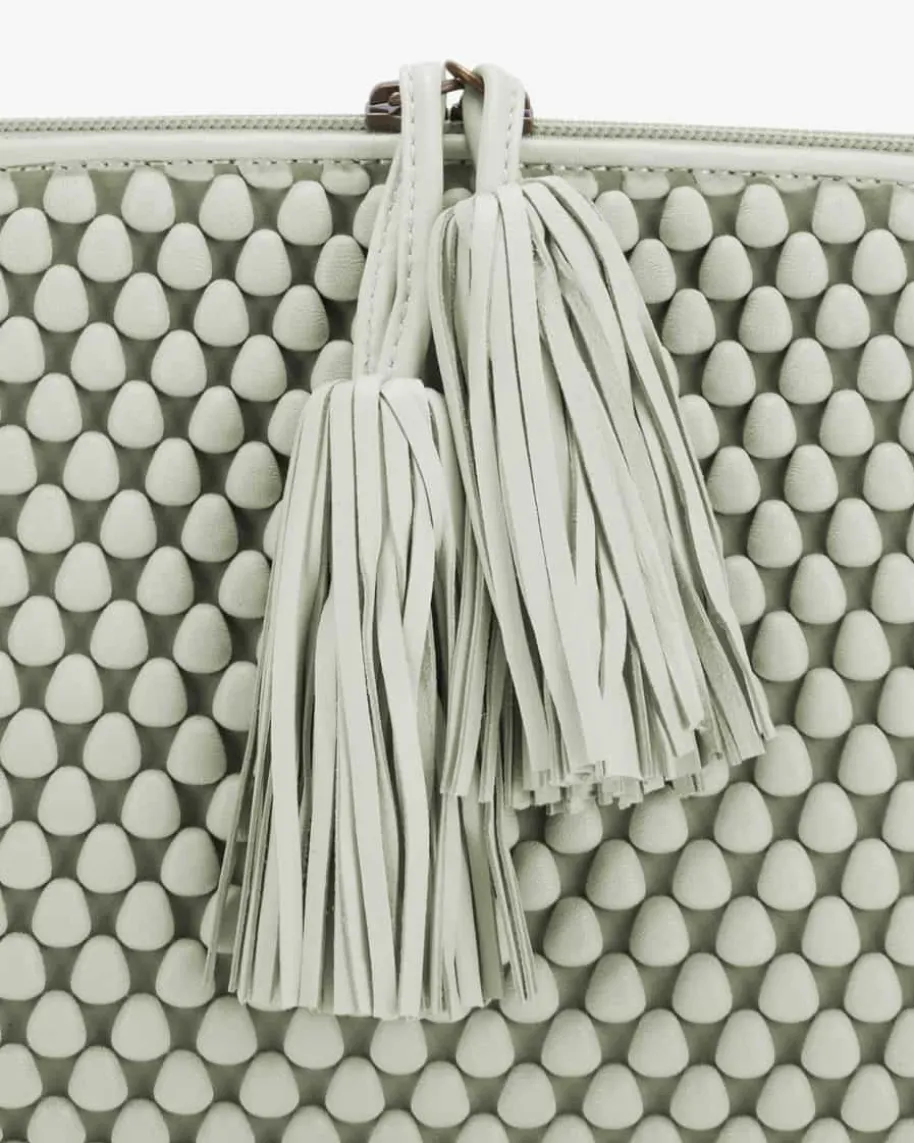 Gizmo Umhängetasche für Damen von Tissa Fontaneda in Hellgrau. Das 2010gegründete Label vereint Handwerkliches Können und Liebe zum Detail. Die soforterkennbare „Bubble Bag“ ist zum Markenzeichen der Kollektion Tissa Fontanedageworden. Auch dieses Modell begeistert in charakteristischer Aufmachung mitstrukturierter Optik, während die Quasten-Applikation den letzten Schliffverleiht.
