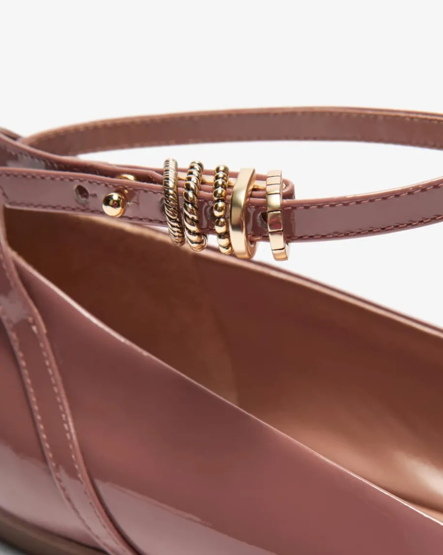 Glossy Shine Ballerinas für Damen von Dorothee Schumacher in Altrosa. Das Modellin hochwertiger Lackleder-Aufmachung präsentiert sich dank der eckigenZehenpartie als modischer Begleiter im Dark Romance-Stil, während der Riemen mitdekorativen Metall-Schlaufen nicht nur für zusätzlichen Halt sorgt, sondern auchden letzten besonderen Schliff verleiht.
