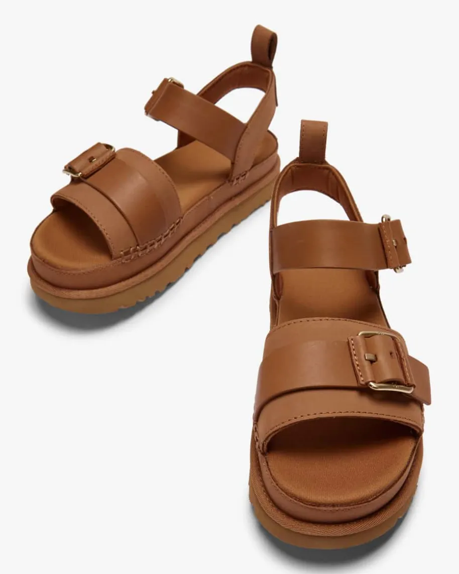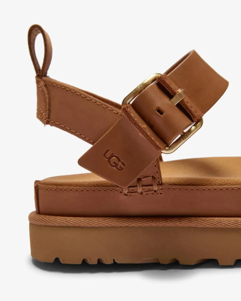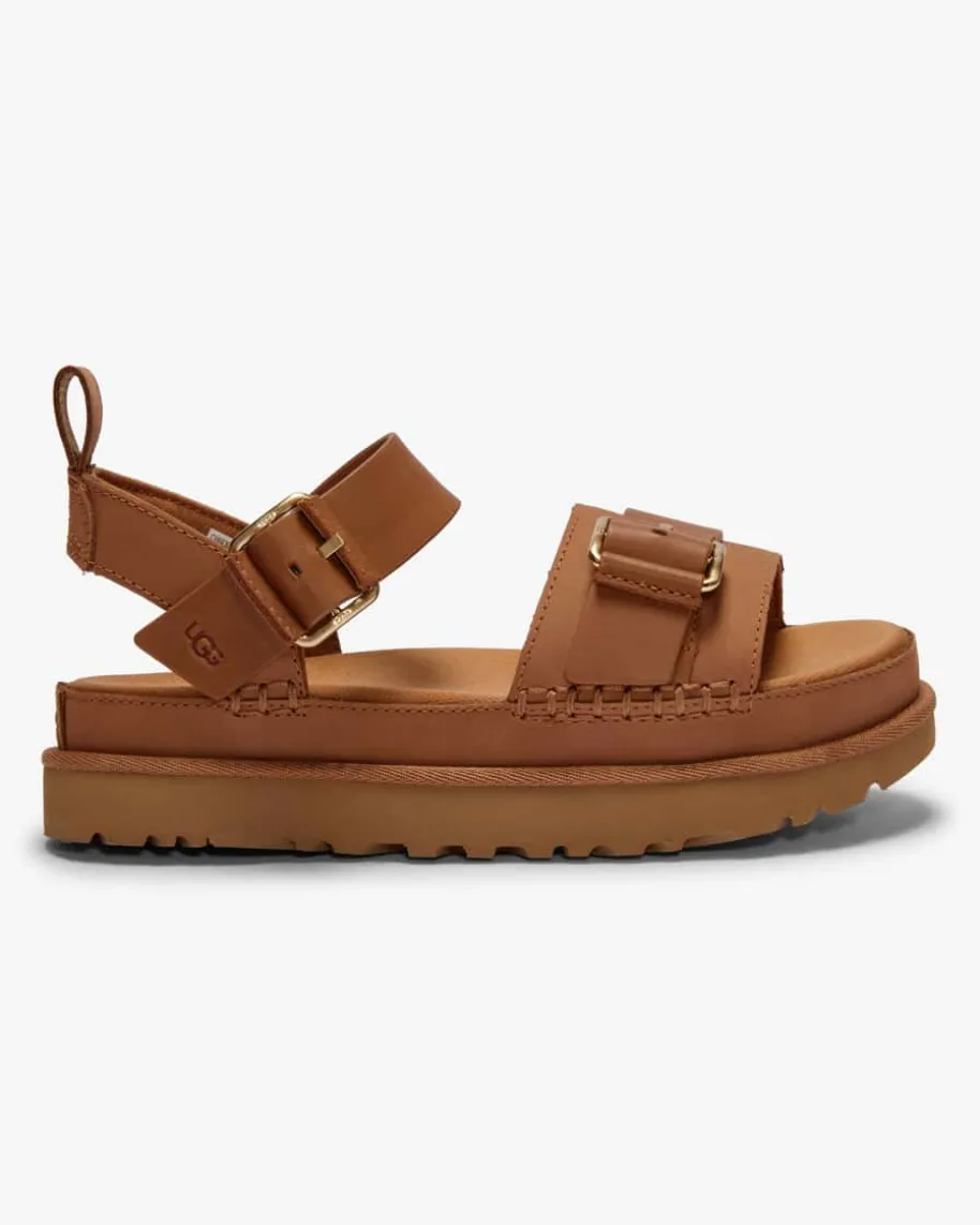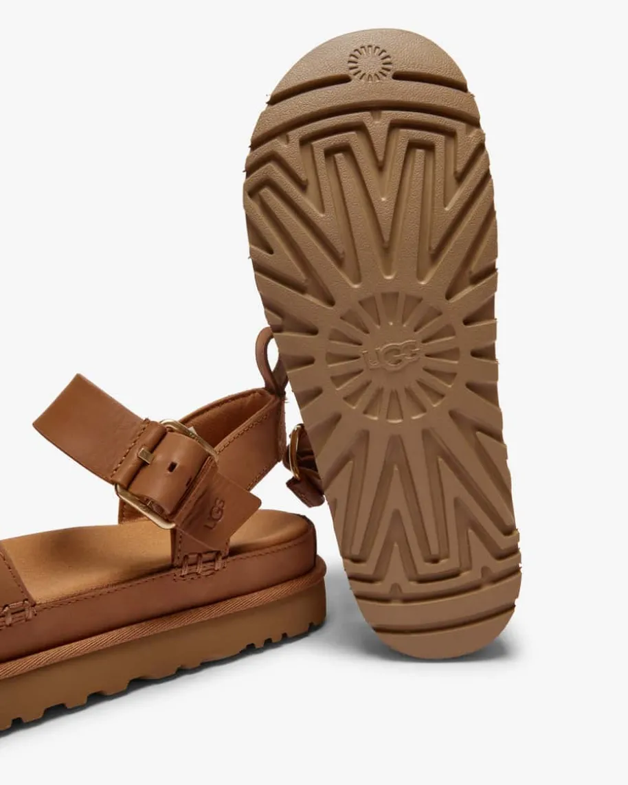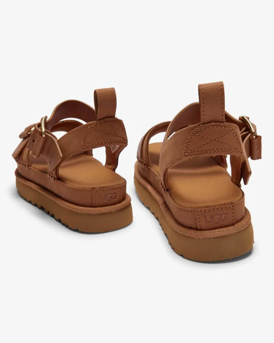 Goldenstar Villa Sandalen für Damen von Ugg in Braun. Der komfortable Klassikerneu interpretiert – Während die softe Veloursleder-Haptik an die Classic Bootserinnert, kreiert das offene Design mit Plateausohle und verstellbaren Riemeneinen modernen Begleiter für aktive Sommertage. Zugleich sorgen das gepolsterteSchaumstoff-Fußbett sowie die leichte Außensohle für besonders hohen Komfort.