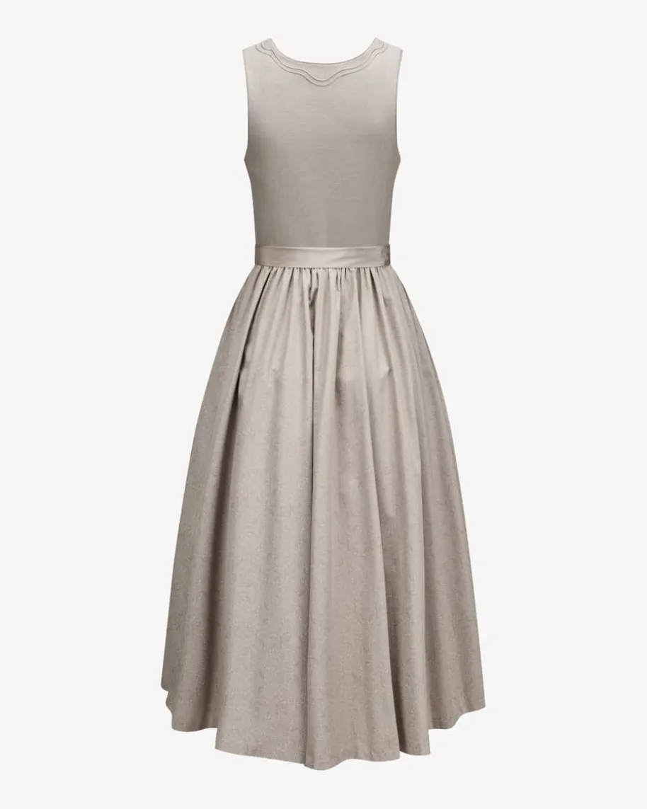 Grace Dirndl lang mit Seidenschürze für Damen von Tostmann in Taupe.Österreichische Traditionsmarke mit eigener Manufaktur – authentisch, zeitlos,hochwertig. Auch dieses Modell besticht mit Mieder in Leinen-Aufmachung, währendder Rock in abstraktem Dessin und die changierende Seidenschürze dentraditionellen Look gekonnt ergänzen.