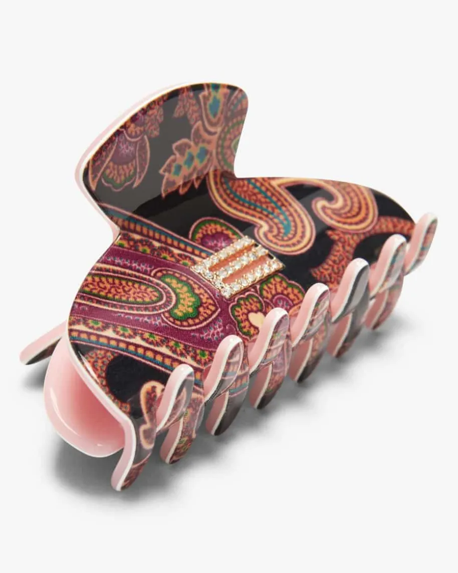 Haarklammer für Damen von Etro in Navy, Violett und Terrakotta. Die Haarspangezeichnet sich durch das labeltypische Paisley-Dessin sowie den edlenSchmuckstein-Besatz aus und avanciert so zum stilvollen Accessoire, das jederFrisur das gewisse Etwas verleiht.