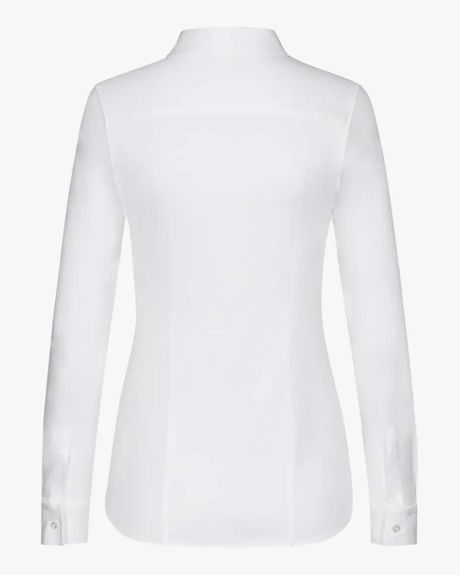 Hemdbluse für Damen von Soluzione in Weiß. Das Modell erreicht durch die Jersey-Qualität eine höhere Elastizität und ist deshalb besonders weich und angenehm zutragen. Die taillierte Form und die optimale Länge machen die Bluse zumperfekten Begleiter für geschäftliche wie auch private Anlässe. Die schmaleKnopfleiste und die dezenten Abnäher runden das Modell gekonnt ab.