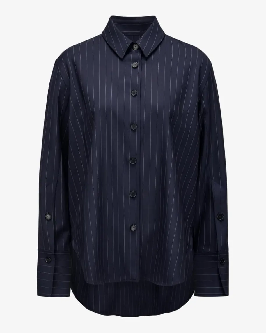Hemdbluse für Damen von Windsor in Navy und Creme. Das Modell präsentiert sichdank der weiten Passform sowie der glatten Schurwoll-Verarbeitung als modernerFavorit mit Business-Chic-Charakter. Zugleich verleiht das stilvolleNadelstreifen-Dessin den letzten Schliff. Für einen stilsicheren Power-Auftrittkönnen Sie die dazu passende Hose kombinieren.