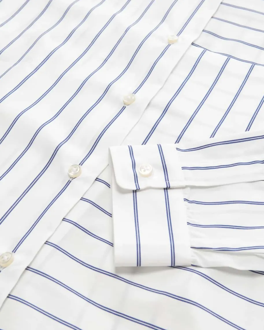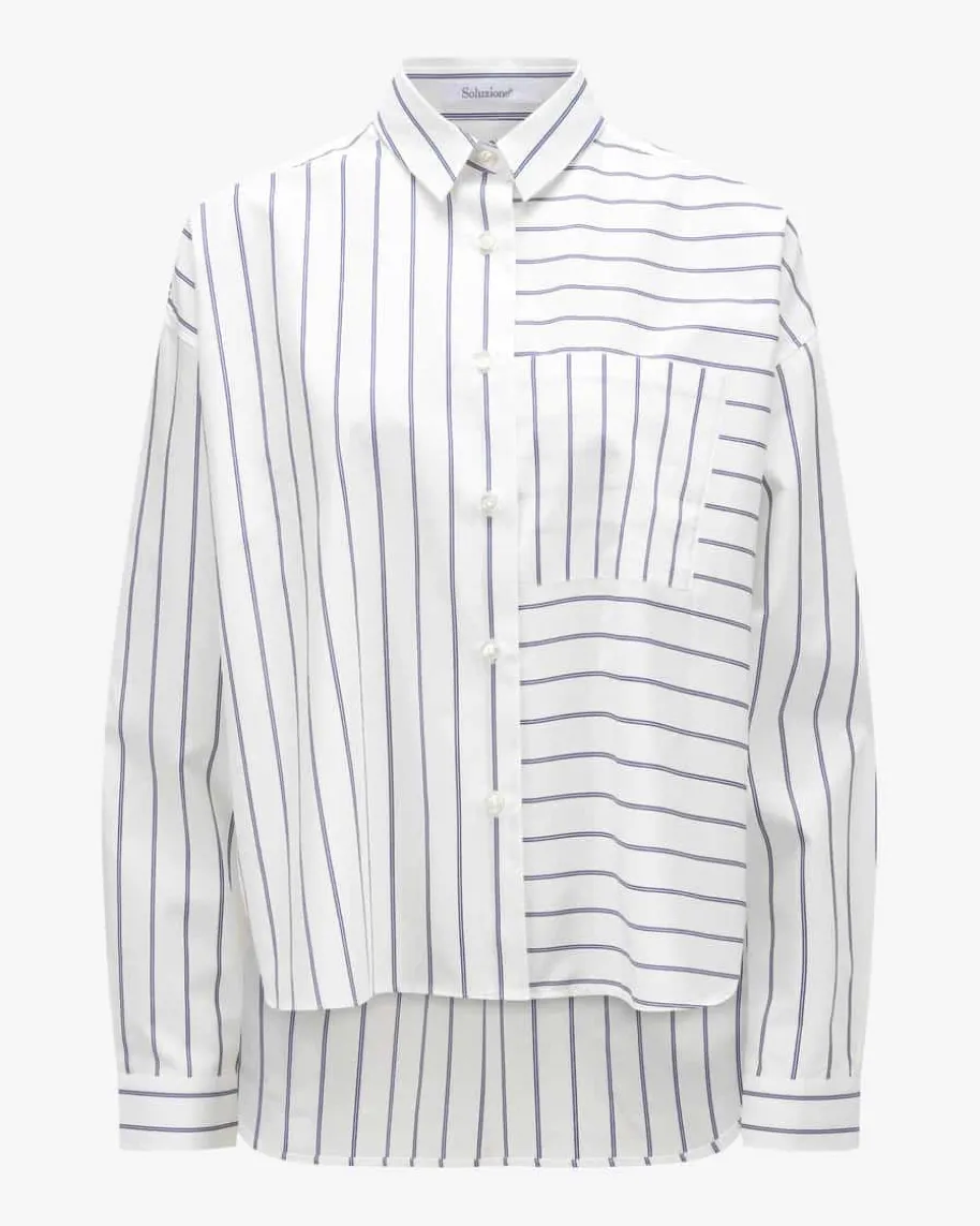 Hemdbluse für Damen von Soluzione in Weiß und Blau. Während die angenehm leichteBaumwoll-Qualität für hohen Tragekomfort sorgt, avanciert das Modell dank weiterPassform und maritimem Streifenmuster zum stilvollen Business-Begleiter mitmodischem Touch.
