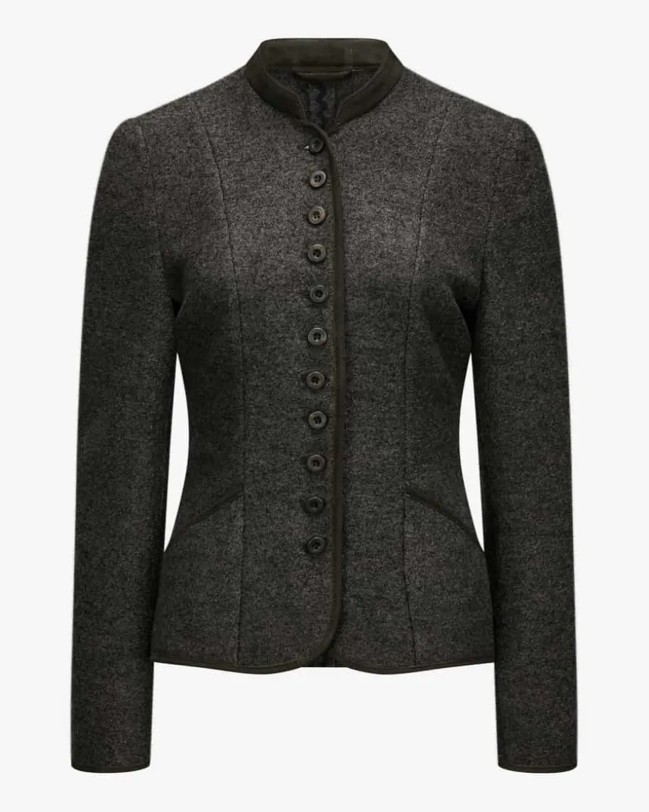 Hillary Trachten-Strickblazer für Damen von Meindl in Schiefer. Dastraditionelle Modell überzeugt durch zeitlose Eleganz in hochwertiger Schurwoll-Qualität. Die feminine Passform und tonige Paspelierungen runden den Trachten-Style harmonisch ab.