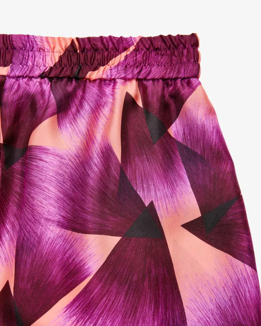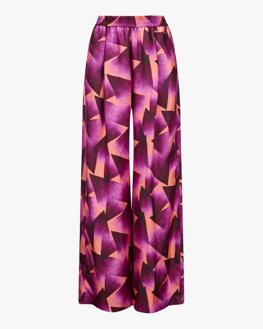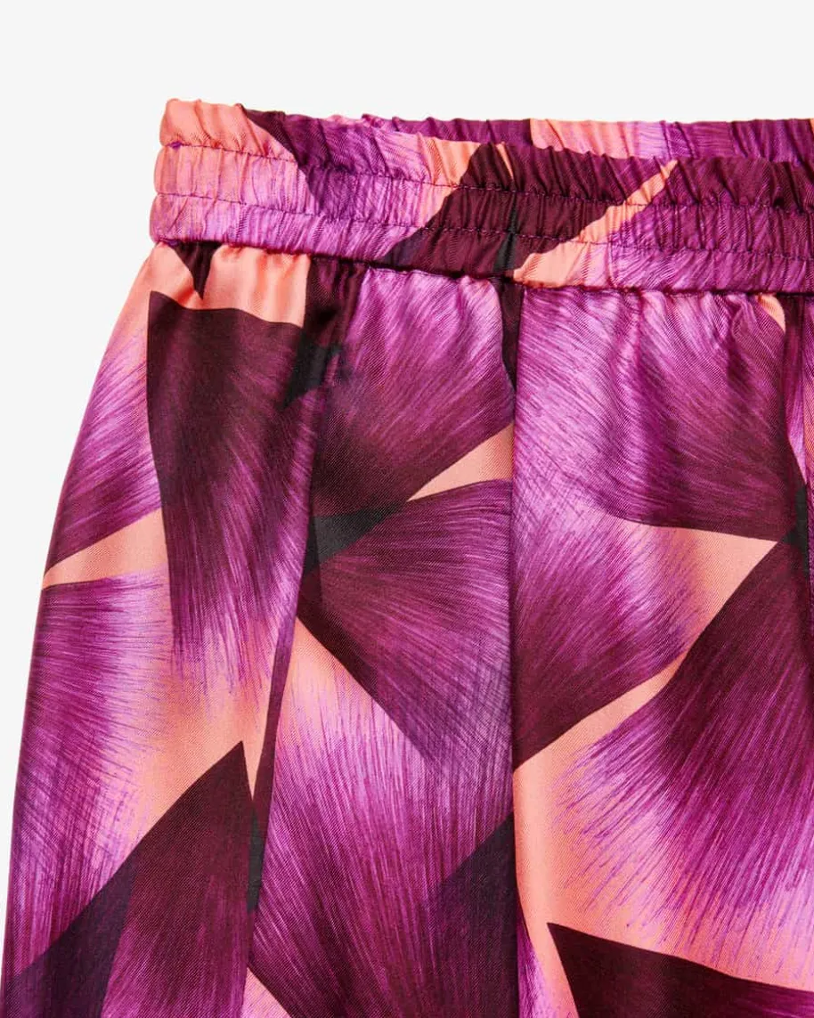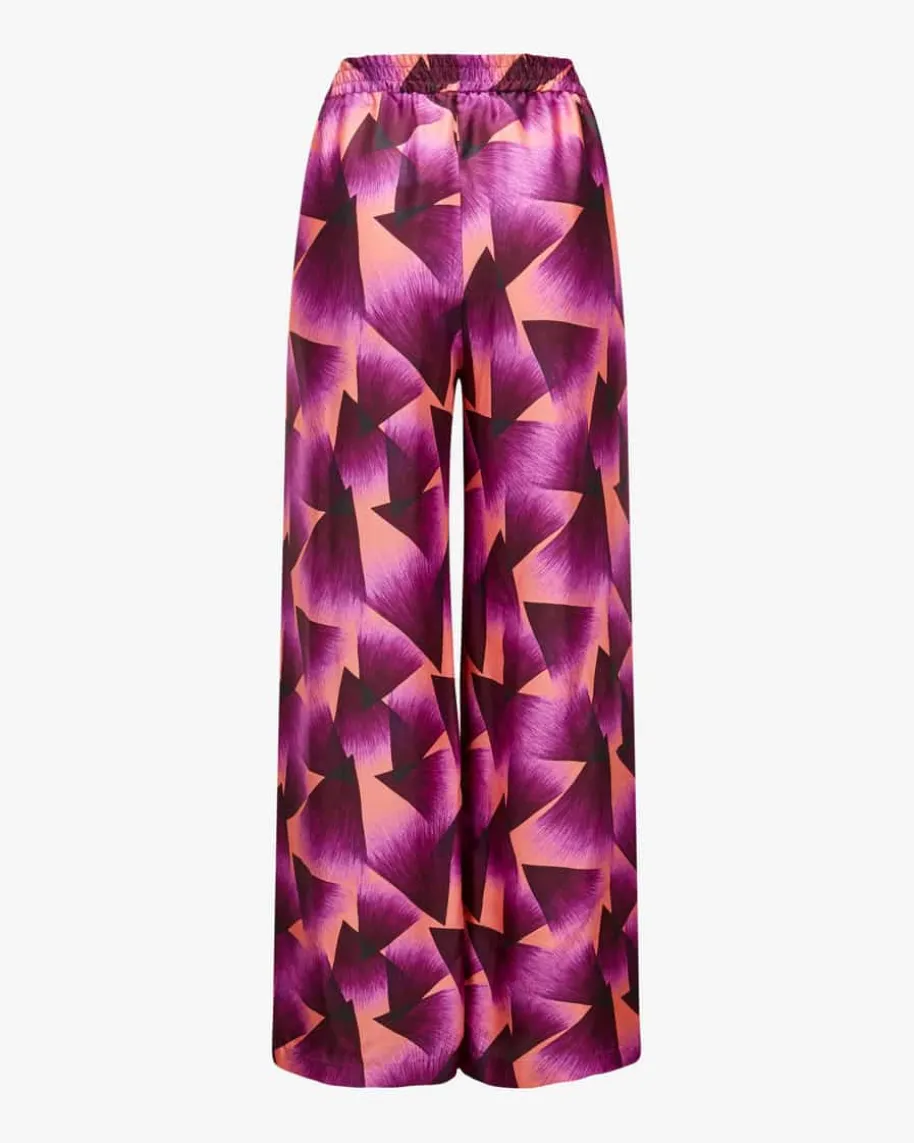 Seidenhose für Damen von Odeeh in Violett und Apricot. Das Modell besticht dankdes geometrischen Allover-Dessins als modischer Favorit, während die hochwertigeSeiden-Qualität eine besonders angenehme Haptik verspricht.