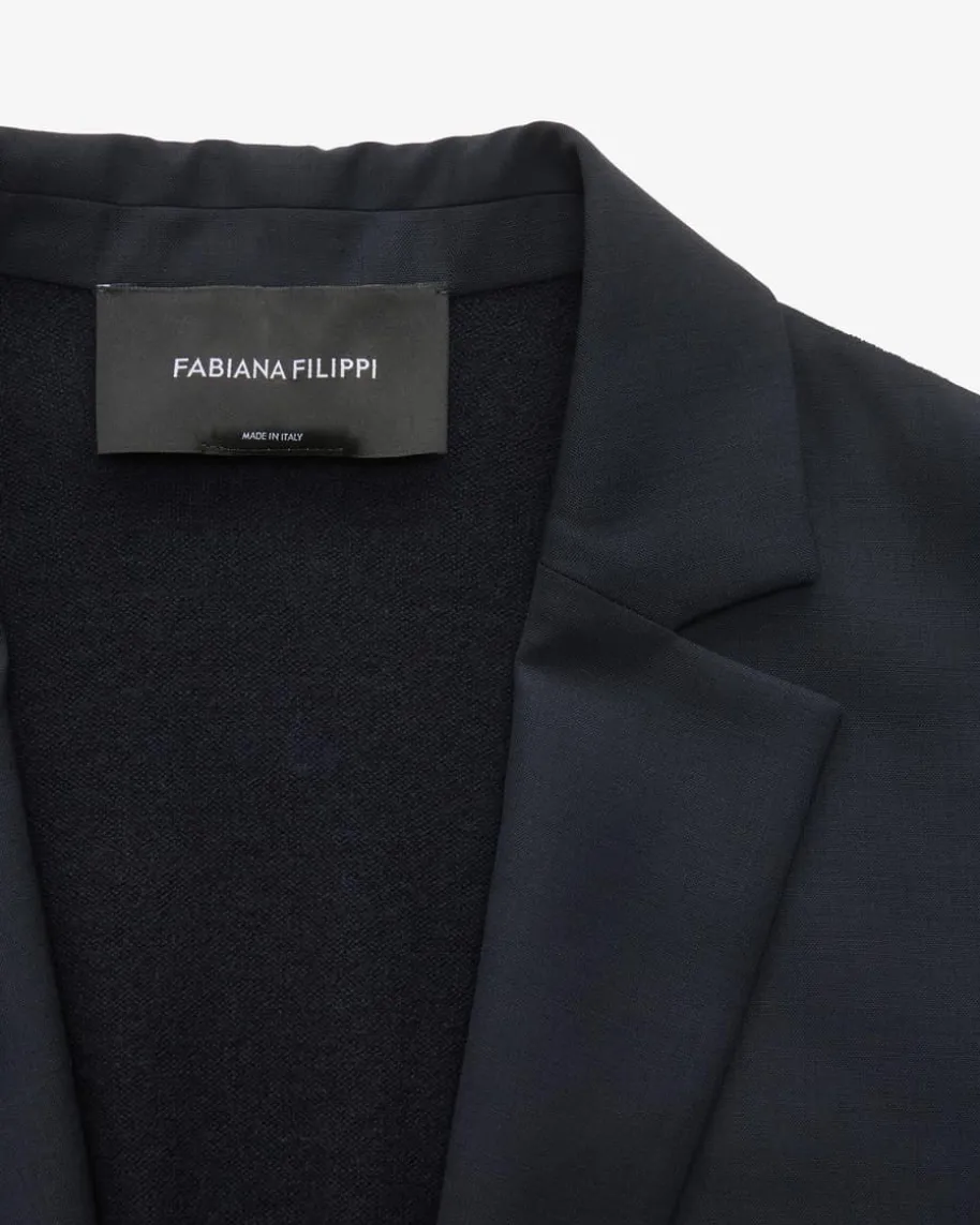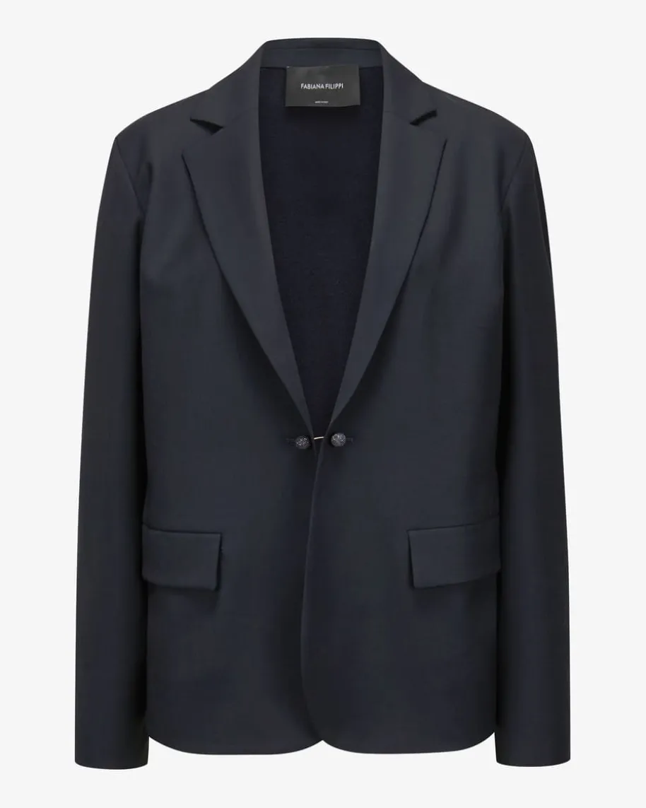 Hybrid-Blazer für Damen von Fabiana Filippi in Navy. Das leichte Modell bestichtdurch die raffinierte Material-Kombination aus Cool Wool-Vorderseite undFeinstrick-Rückseite mit besonders hohem Tragekomfort und legerem Charakter,welcher durch den Schmuckstein-Verschluss einen eleganten Touch erhält.
