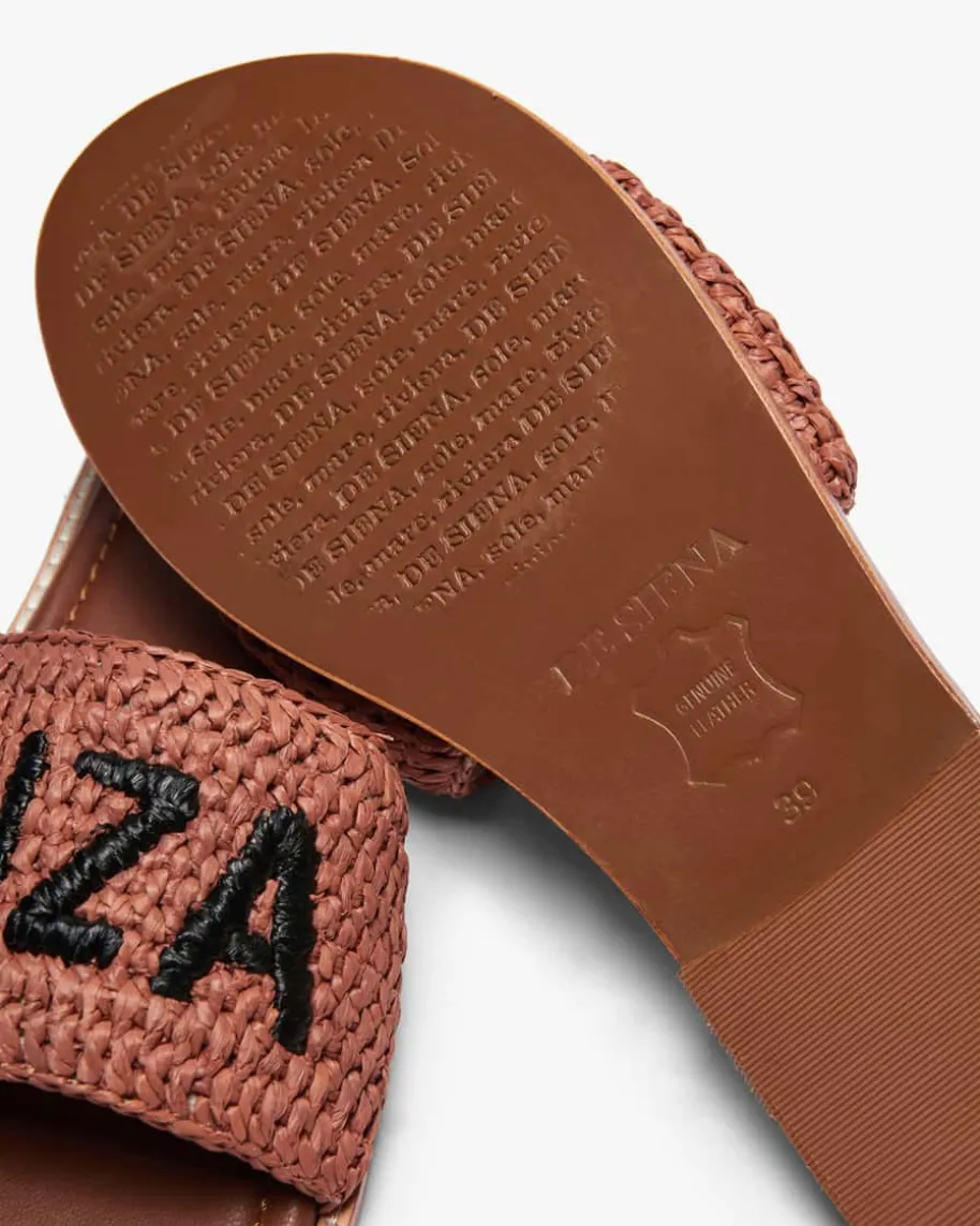 Capri Pantoletten für Damen von De Siena in Braun und Schwarz. Die Kombinationaus hochwertigem Glattleder und sommerlichem Bast schafft einen modischenFavoriten für heiße Tage, während der gestickte Schriftzug gekonnt Akzentesetzt.