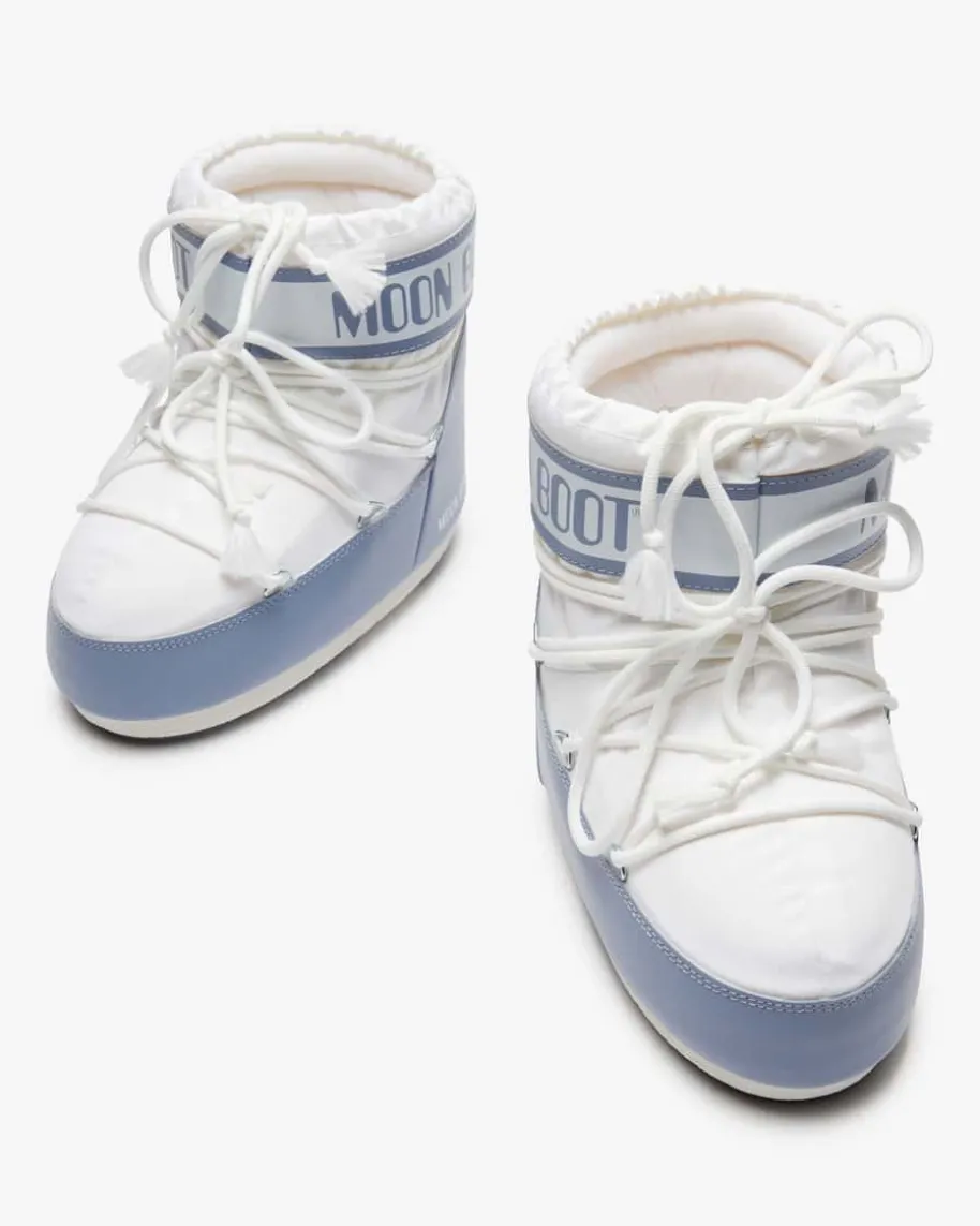 Icon Low Moon Boots für Damen von Moon Boot in Weiß und Hellblau. Das in den1970erJahren gegründete Label hat seine Inspiration in der Mondlandung von NeilArmstrong gefunden. Mit wasserabweisender Beschichtung präsentiert sich derWinterstiefel in gewohnt futuristischer Aufmachung. Diverse Logo-Details sowiedie labeltypische Schnürung vollenden das modische Gesamtbild gekonnt.