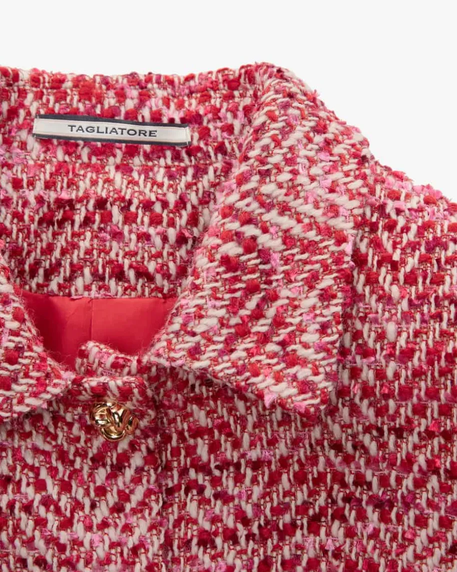 India Bouclé-Blazer für Damen von Tagliatore in Rot, Rosa und Creme. Dank derauffallenden Bouclé-Optik in femininer Farbkombination punktet das dezenttaillierte Modell als stilsicherer Begleiter, welcher durch die Klappentaschenund die Casual Silhouette gekonnt in Szene gesetzt wird. Zusätzlich kreieren diegoldfarbenen Knöpfe einen modernen Kontrast.