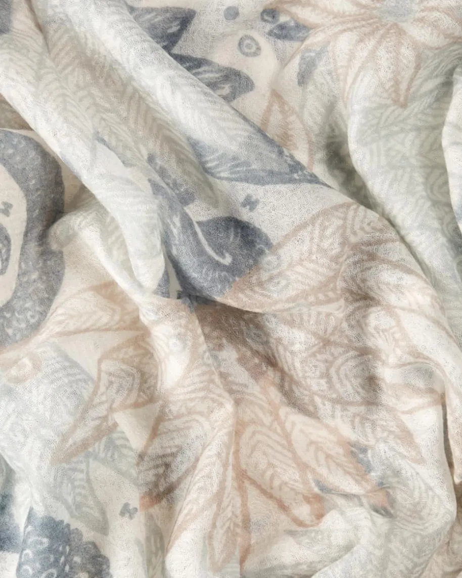 Inke Cashmere-Schal für Damen von Hemisphere in Weiß, Taupe und Blaugrau. Dankder Verwendung von hochwertiger Cashmere-Wolle in semitransparenter Aufmachungbegeistert das Accessoire mit besonders angenehmer Haptik. Das florale Allover-Dessin sowie Fransen-Details verleihen zusätzlich einen besonderen Charme.