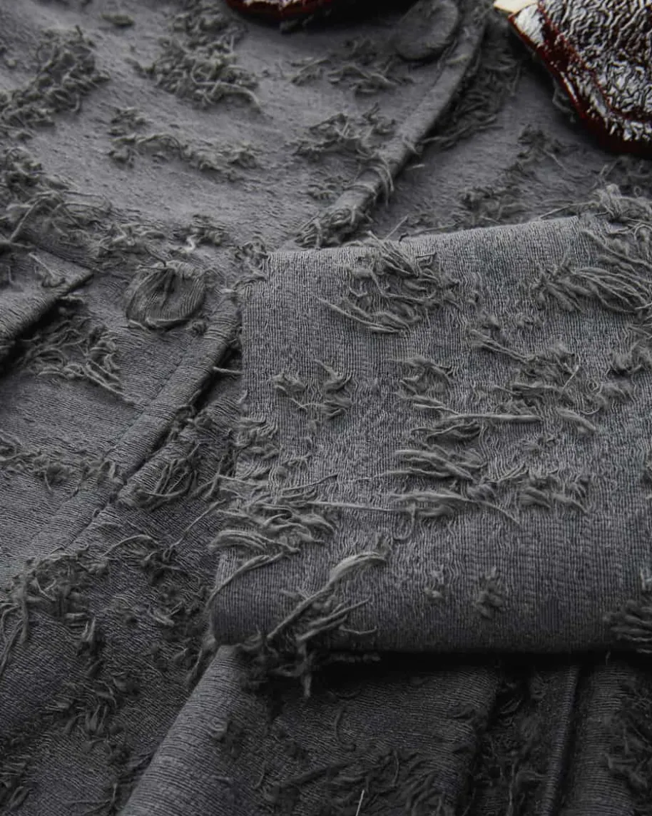 Jacke für Damen von Odeeh in Grau und Mahagoni. Das Modell in modischerJacquard- Aufmachung präsentiert sich dank markantem Bubikragen in Lackleder-Optik sowie Fransen- Details als moderner Dark Romance-Favorit, welcher dank demSchößchen einen femininen Twist mit Babydoll-Charakter erhält.