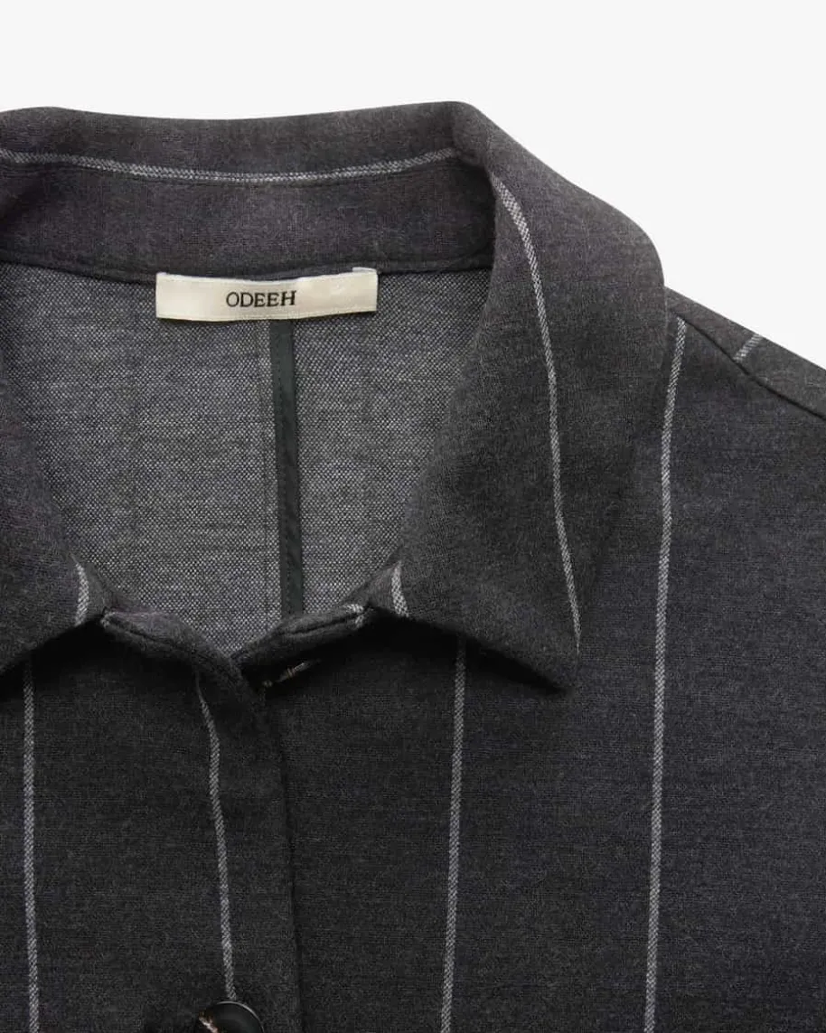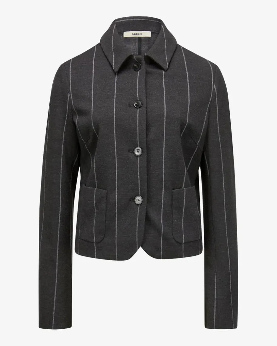 Jacke für Damen von Odeeh in Anthrazit und Weiß. Das ungefütterte Modellverwandelt sich durch die Blazerjacken-Silhouette mit abgerundetem Saum in einenstilvollen Begleiter, welcher durch die elastische Jersey-Qualität aushochwertigem Schurwoll-Baumwoll-Mix mit hohem Tragekomfort punktet. DasNadelstreifen-Dessin rundet den Look modisch ab.