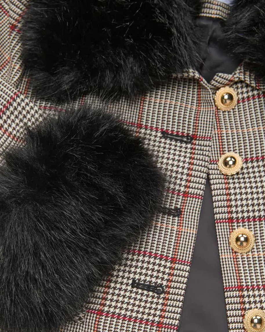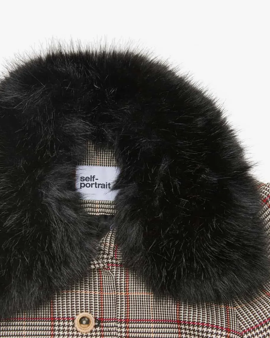 Jacke für Damen von Self-Portrait in Schwarz, Creme und Rot. Das Londoner Labelsteht für moderne Cocktailkleider mit Spitze, Cut-Outs und femininerDetailverliebtheit. Auch dieses klassische Modell begeistert mit raffiniertemGlencheck-Muster und edlen goldfarbenen Knöpfen, während das kuschelige Fake Furan den Ärmelenden und am abnehmbaren Kragen einen Hingucker-Look kreiert.