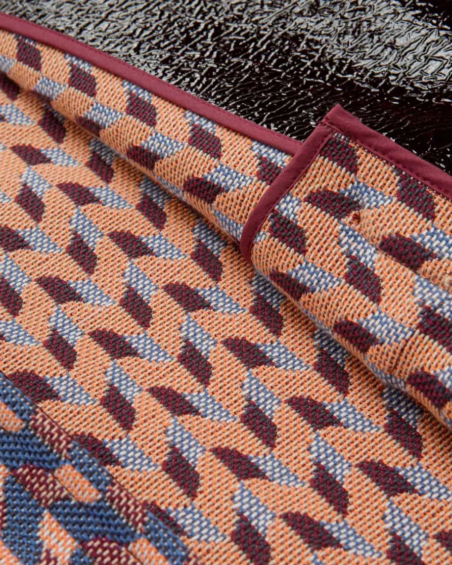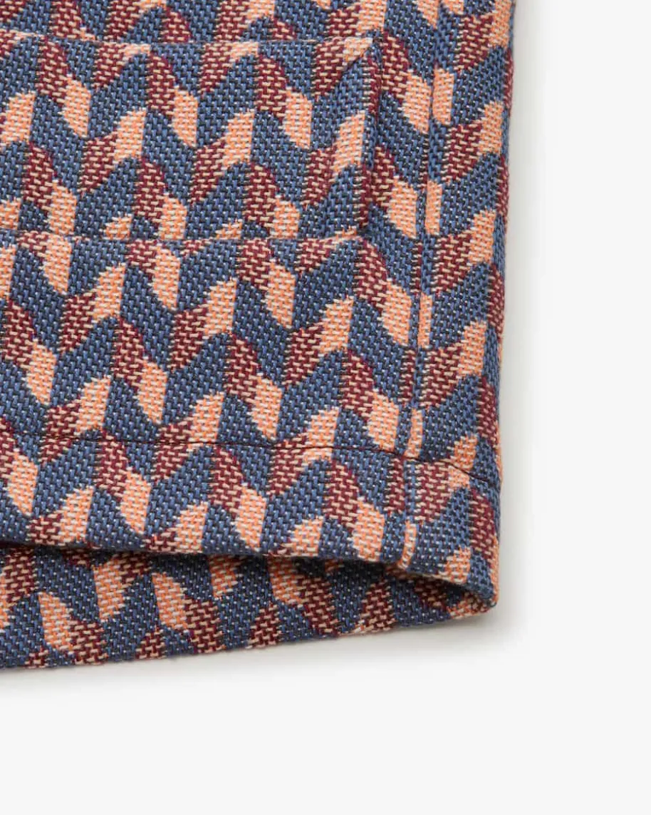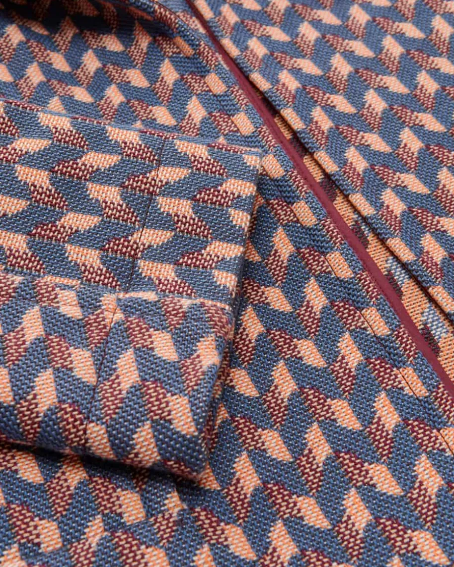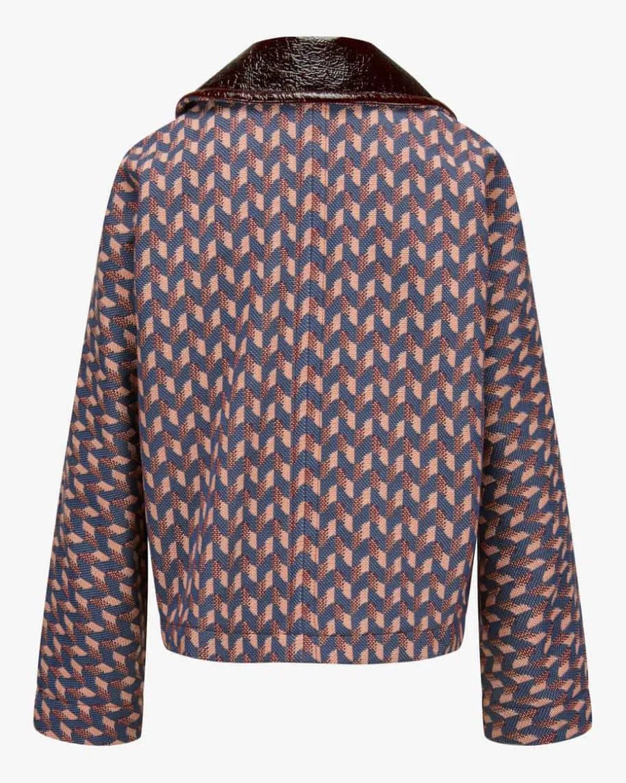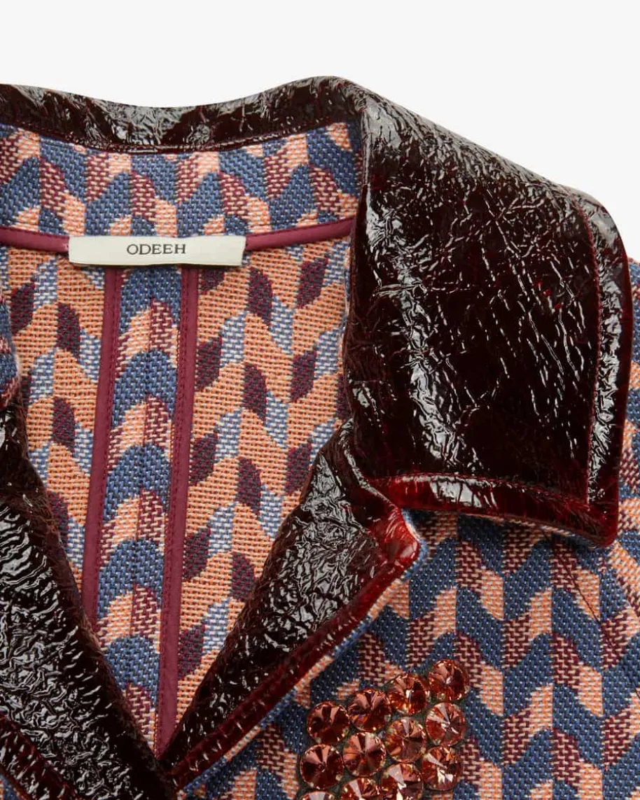 Jacke für Damen von Odeeh in Blau, Lachs und Bordeaux. Das Modell in weiterPassform präsentiert sich dank schwerer Baumwoll-Verarbeitung mit farbenfroherFischgrät-Struktur sowie dem Kragenbesatz in Lackleder-Optik als modernerFavorit mit besonderem Twist. Die abnehmbare Schmuckstein-Brosche rundet denLook elegant ab.