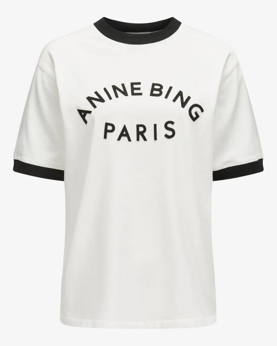 Jaylin T-Shirt für Damen von Anine Bing in Ecru und Schwarz. 2012 in Los Angelesgegründet, vereint das Label skandinavischen Minimalismus mit amerikanischerCoolness. Das Modell in moderner Passform überzeugt dank hochwertiger Baumwoll-Qualität, während die auffällige Logo-Applikation den Gesamtlook gekonntabrundet.