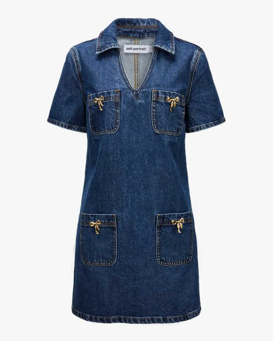 Jeanskleid für Damen von Self-Portrait in Dunkelblau. Das Modell präsentiertsich in stilvoller Denim-Aufmachung, die durch die schmale Passform gekonntabgerundet wird. Die goldfarbenen Schleifen-Applikationen und der tiefeAusschnitt mit Kragen verleihen dem Look zudem einen modischen Charakter.