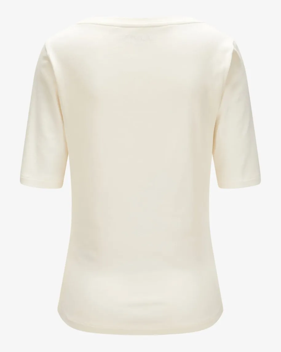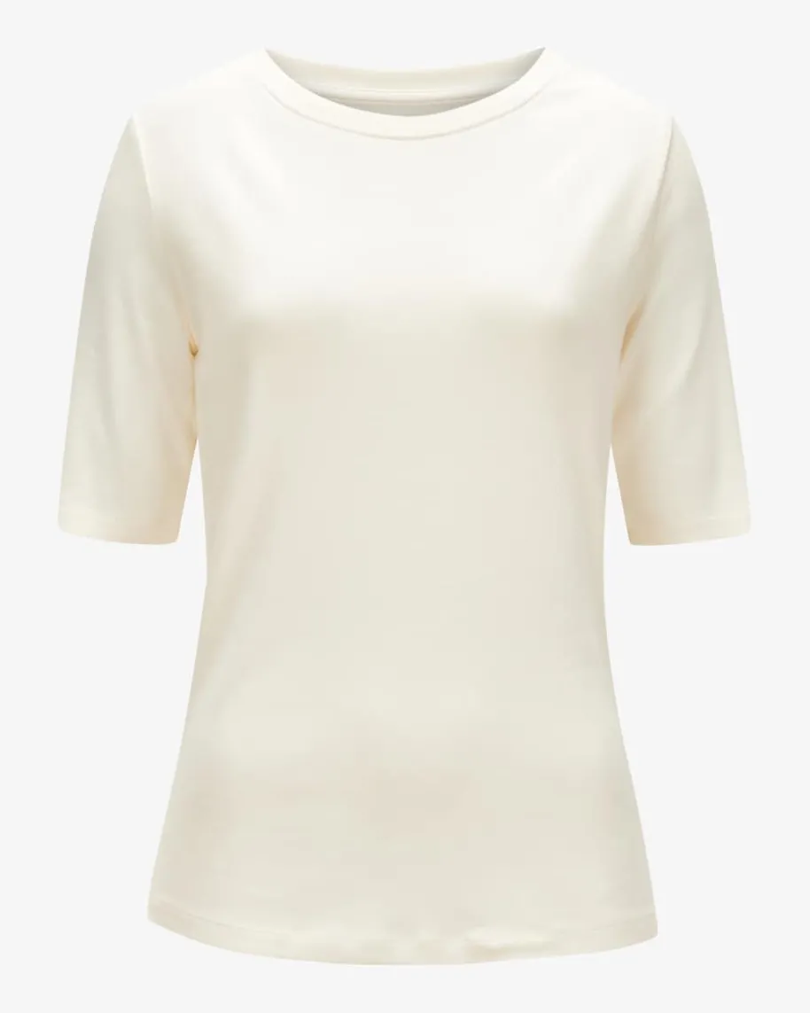 Jette T-Shirt für Damen von Juvia in Ecru. Während der elastische Material-Mixeine besonders softe Haptik verleiht, kreieren die verlängerten Ärmel zusammenmit der semitransparenten Optik ein angenehmes Basic für vielseitige Lagen-Looks.