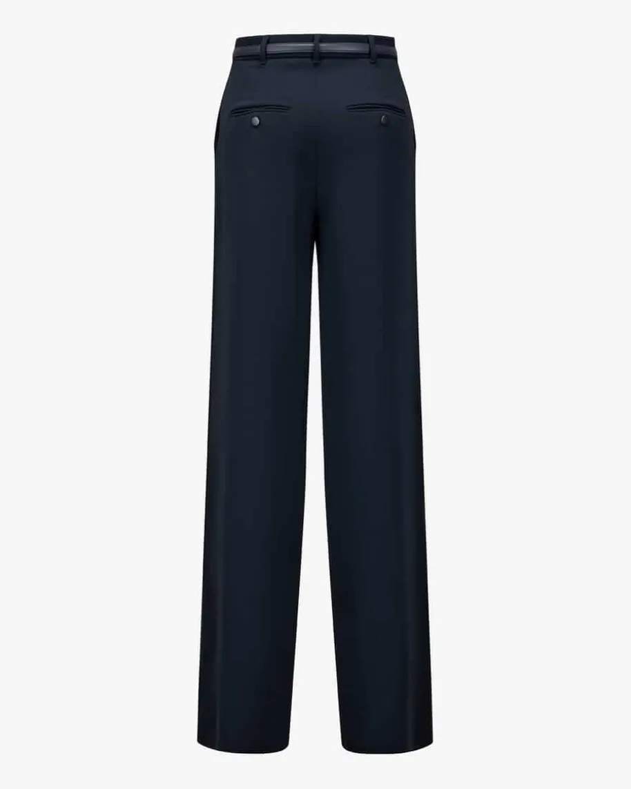 Jez Hose für Damen von Max Mara Studio in Navy. Das Modell überzeugt inschlichter Aufmachung mit weitem Bein und hohem Bund, während der schmaleLedergürtel mit goldfarbenem Stift-Verschluss den edlen Business-Stil gekonntinszeniert.