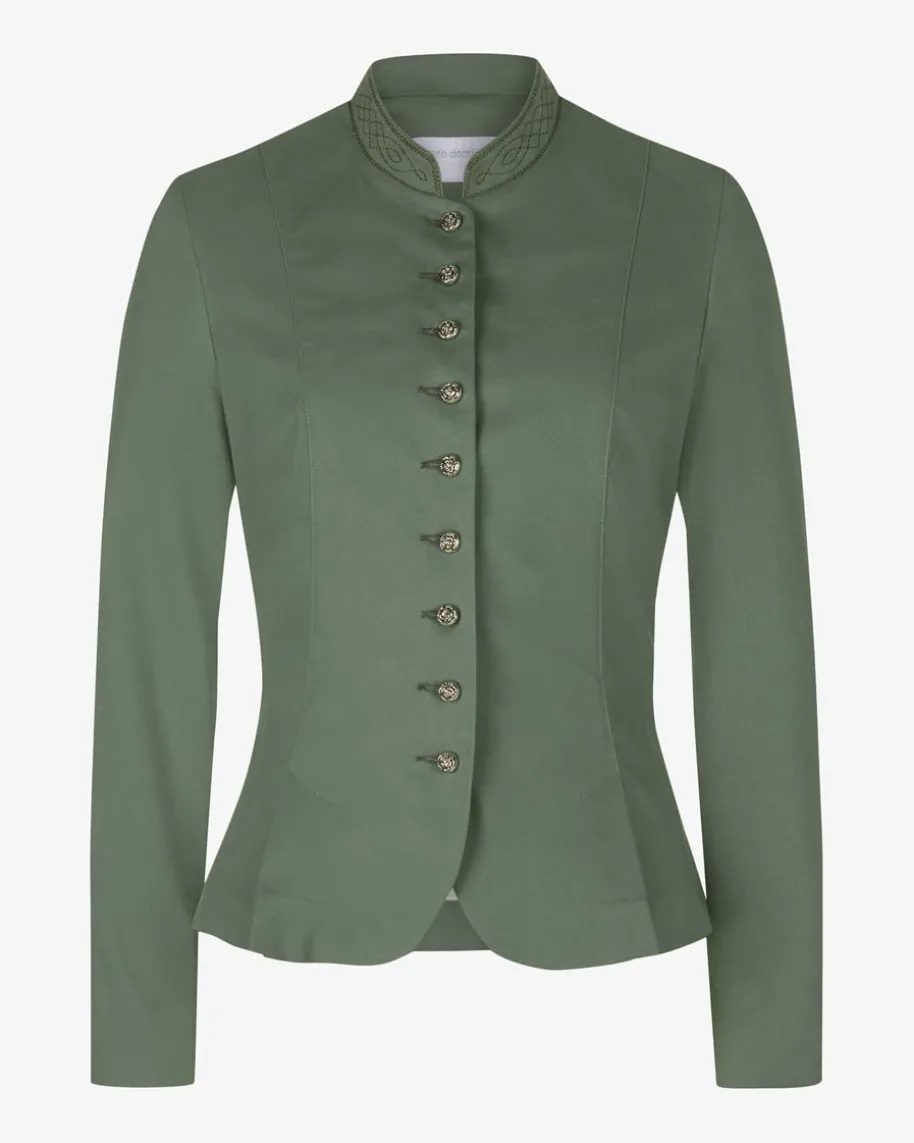 Juliane Trachtenblazer für Damen von Anno Domini in Dunkelgrün. Aus elastischerBaumwoll-Qualität gefertigt, begeistert das taillierte Modell mit femininemSitz, während Zierstickereien sowie raffinierte Knöpfe in Rosen-Optik denTrachten-Look gekonnt vollenden.
