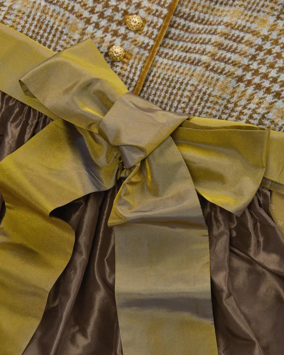 Kathi Tweed Midi-Dirndl mit Seidenschürze für Damen von Susanne Spatt in Ocker,Hellgrau und Khaki. Alle Dirndl von Susanne Spatt werden stets aus hochwertigenGrundmaterialien und komplett in Österreich gefertigt, um höchstenQualitätsanforderungen zu entsprechen. Das Mieder in Tweed-Qualität mitHahnentritt-Muster, der Rock mit filigranem Dessin sowie die changierendeSeidenschürze mit kontrastierendem Band kreieren einen besonderen Trachten-Begleiter. Zugleich vollendet die Samt-Borte am Ausschnitt sowie diegoldfarbenen Kugelknöpfe den Trachten-Look gekonnt.