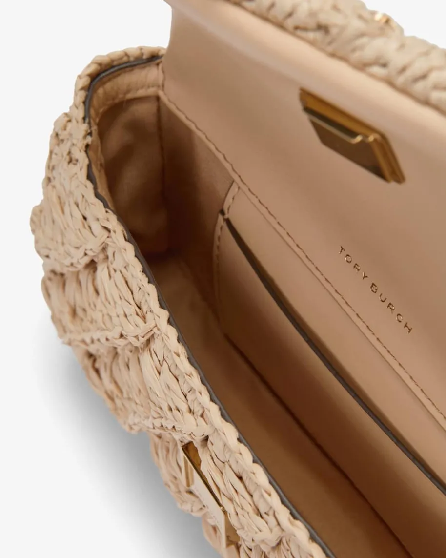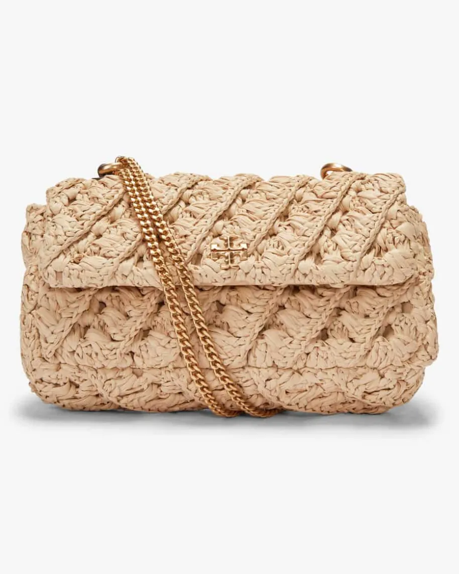 Kira Woven Mini Flap Umhängetasche für Damen von Tory Burch in Natur. Das Modellpräsentiert sich dank sommerlicher Bast-Qualität in moderner Aufmachung, währenddie goldfarbene Gliederkette sowie Logo-Applikation das Gesamtbild elegantvollenden.