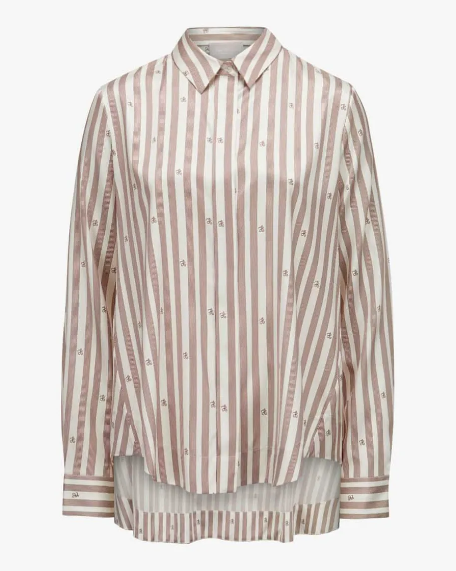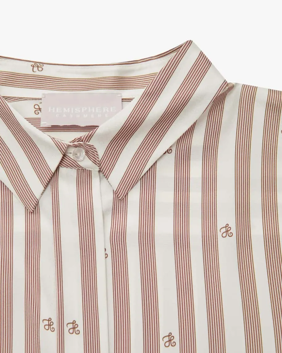 Klara Seiden-Hemdbluse für Damen von Hemisphere in Champagner und Braun. Dankhochwertiger, elastischer Seiden-Qualität überzeugt dieses Modell sowohl mitchangierender Optik als auch mit angenehmem Tragegefühl. Zugleich setzt dasStreifenmuster mit Monogramm-Details den Look labeltypisch in Szene.