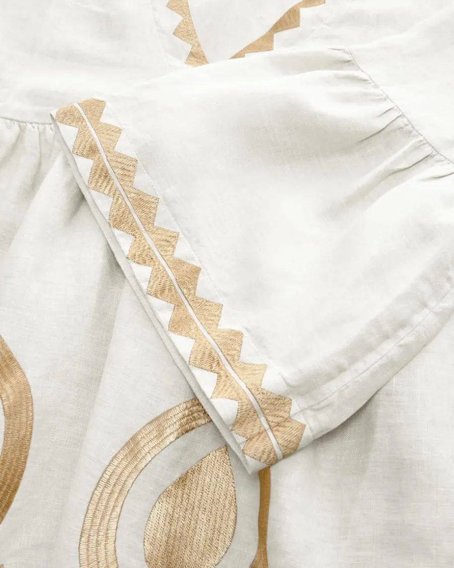 Kleid für Damen von Kori in Sand und Gold. Das Modell präsentiert sich inausgestellter Passform, während die Stickereien besondere Akzente setzen. Dieedle Leinen-Qualität sorgt zudem für einen angenehmen Tragekomfort.