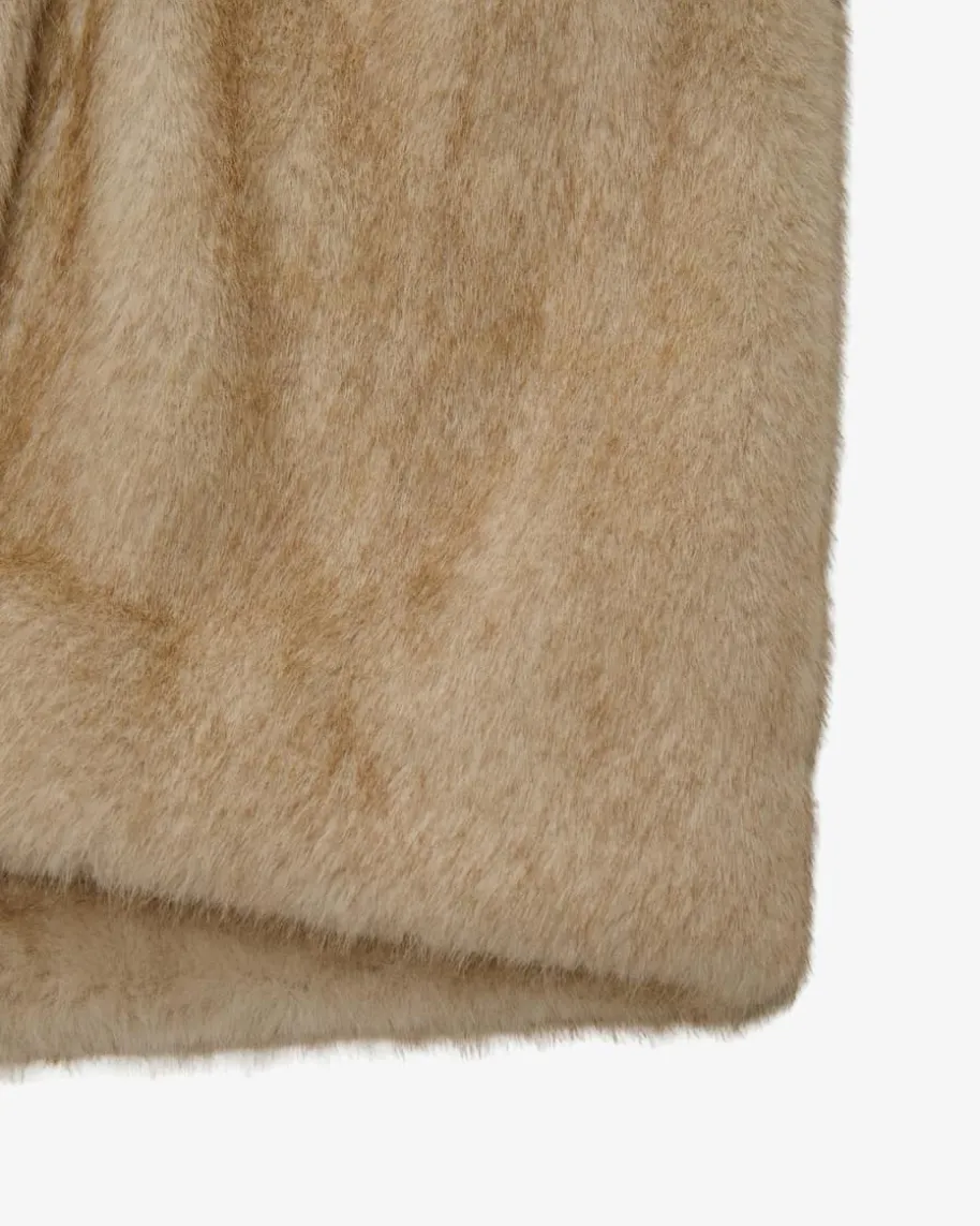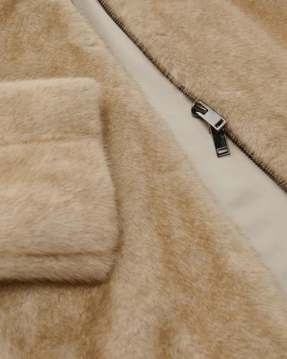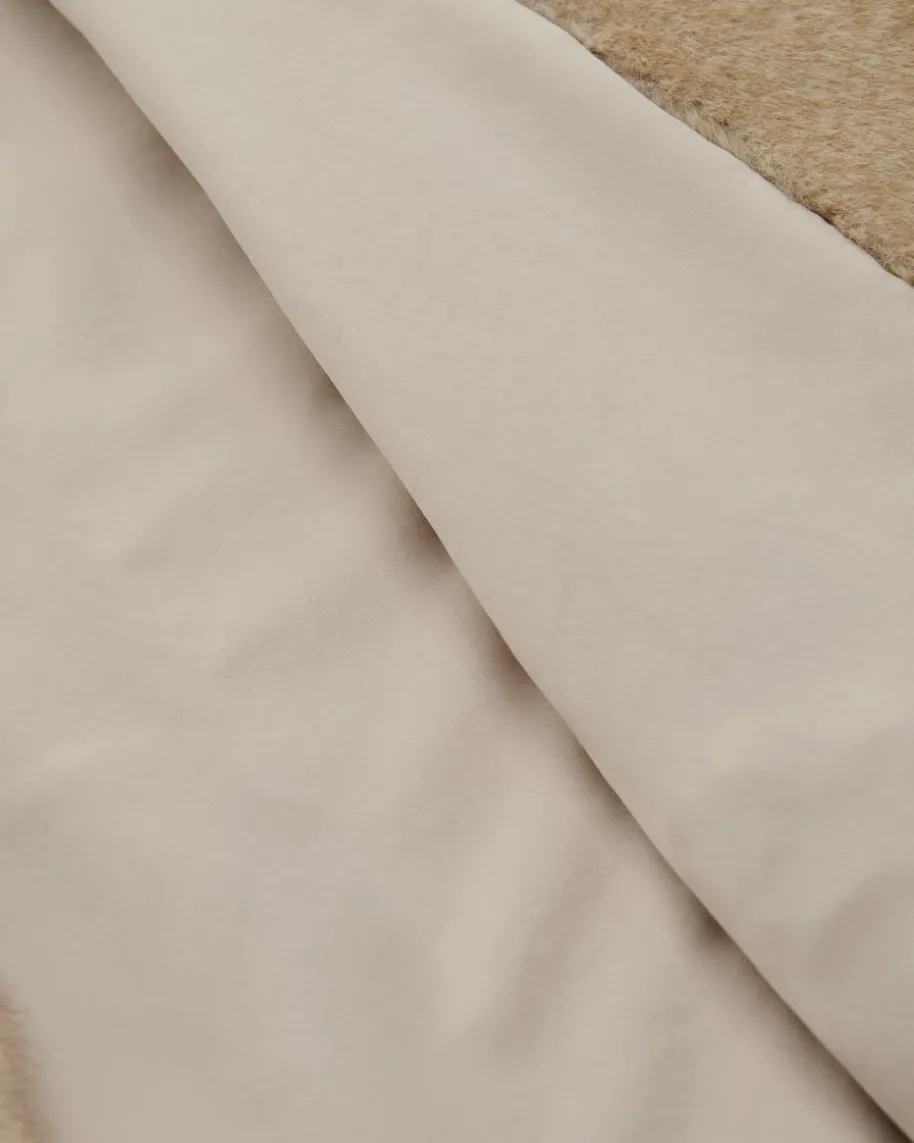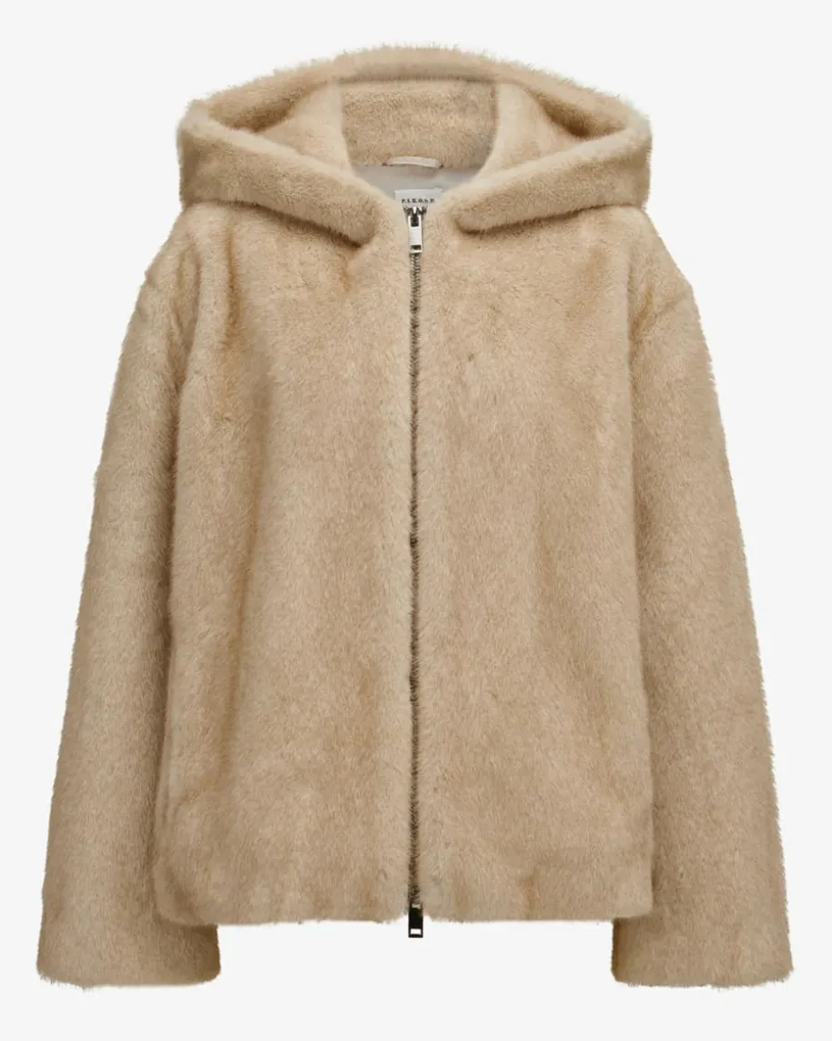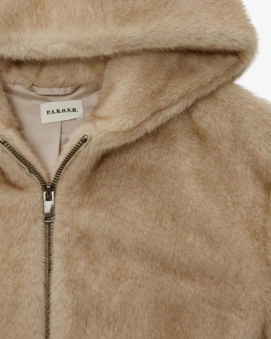 Kunstfelljacke für Damen von Parosh in Sand. Das Modell in kuscheliger Fake-Fur-Aufmachung überzeugt in modernem Design in changierender Optik, während sonstigesportive Details wie die Kapuze einen legeren Alltagsbegleiter schaffen.