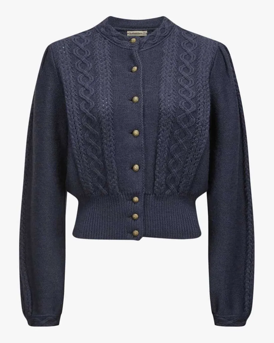 Lea Trachten-Strickjacke für Damen von Gottseidank in Navy. Die feineMerinowolle in raffinierter Strick-Qualität punktet mit besonders angenehmemTragekomfort, während stilvolle Kugelknöpfe sowie die Raffungen an den Schulterndas traditionelle Modell feminin vollenden.