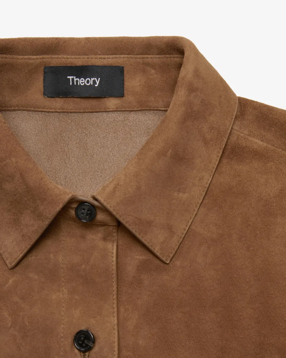 Lederblazer für Damen von Theory in Braun. Gefertigt aus hochwertigerVeloursleder-Qualität punktet das Modell in moderner Country-Aufmachung, währendklassische Details einen modischen Kontrast zur Material-Verarbeitung erstellt.