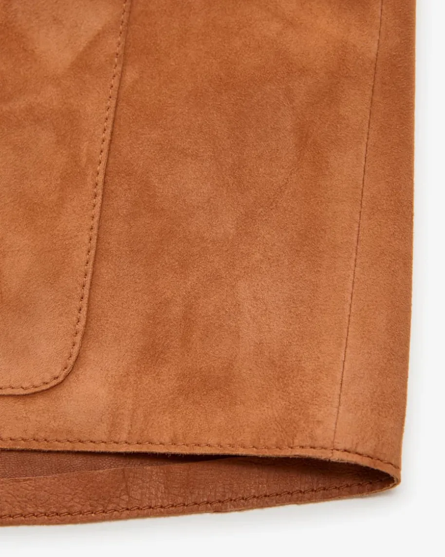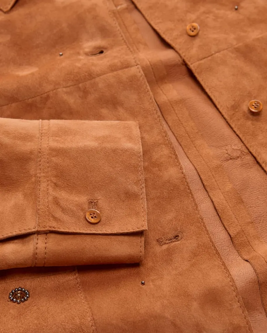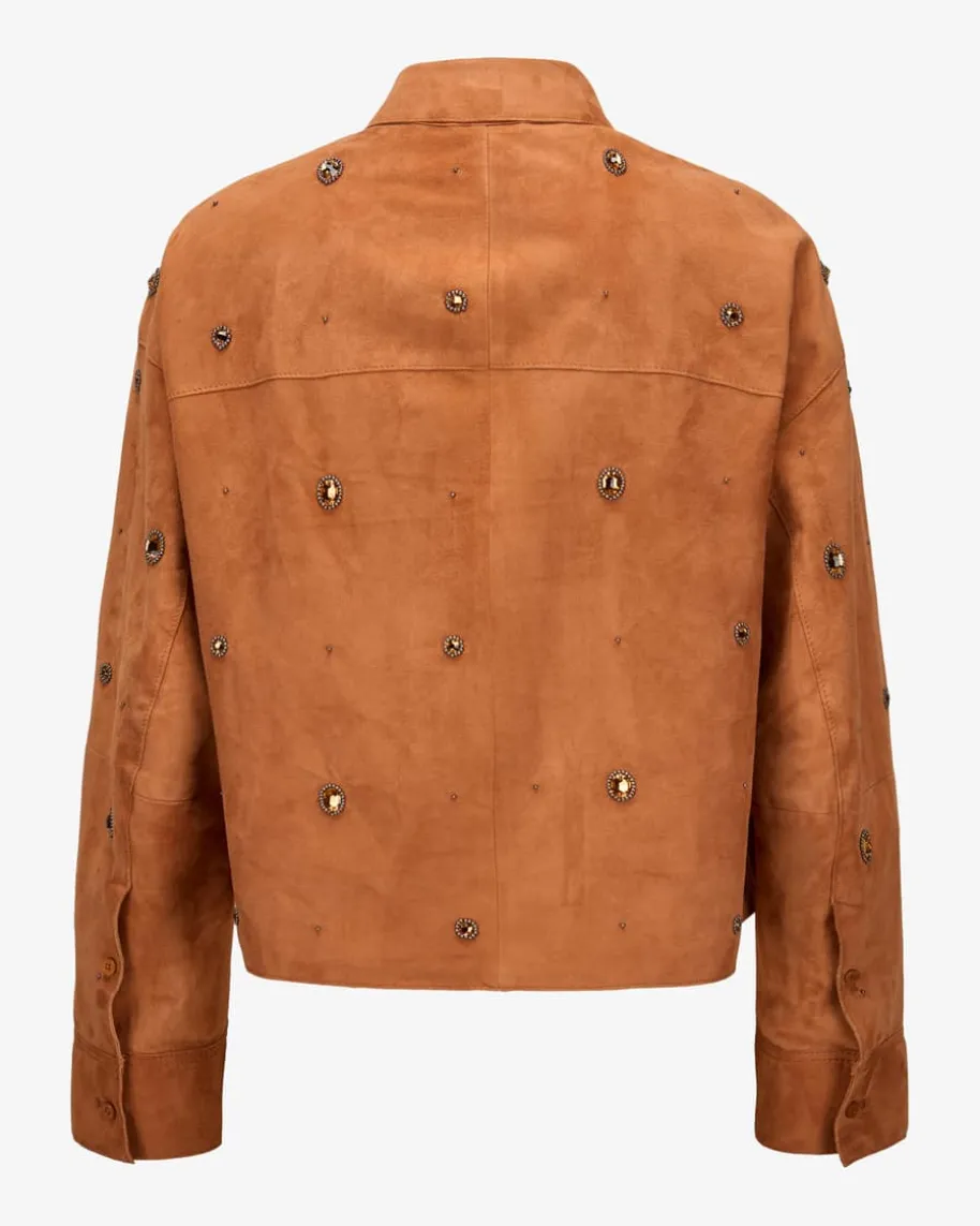 Lederjacke für Damen von Luisa Cerano in Terrakotta. Das Modell überzeugt inhochwertigem Ziegenveloursleder, während die Schmuckstein-Applikation einenbesonderen Begleiter im Equestrian-Stil kreiert, der jedem Outfit einenfemininen Touch verleiht.