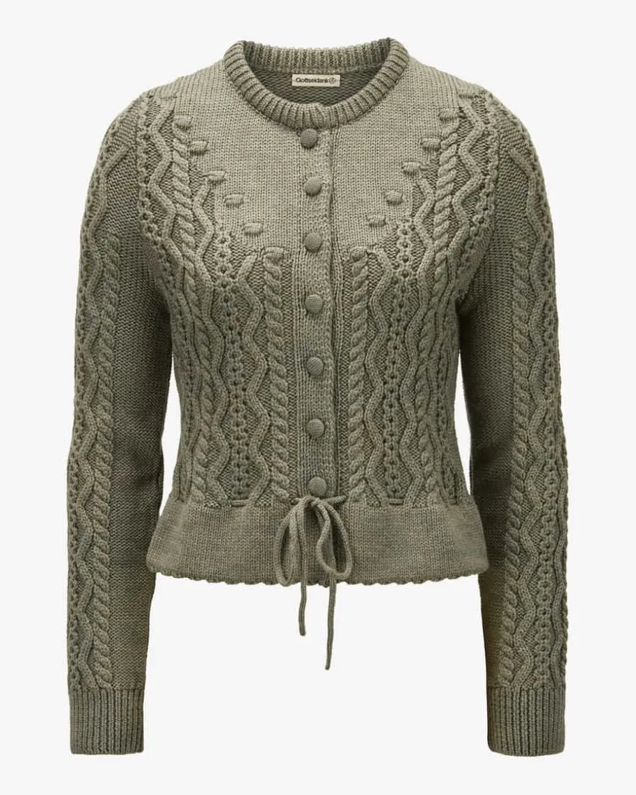 Lene Trachten-Strickjacke für Damen von Gottseidank in Thymian. Die extrafeineMerino-Wolle in raffinierter Strick-Qualität punktet mit besonders angenehmemTragekomfort, während tonale, stoffbezogene Knöpfe sowie der Tunnelzug dastraditionelle Modell feminin vollenden.
