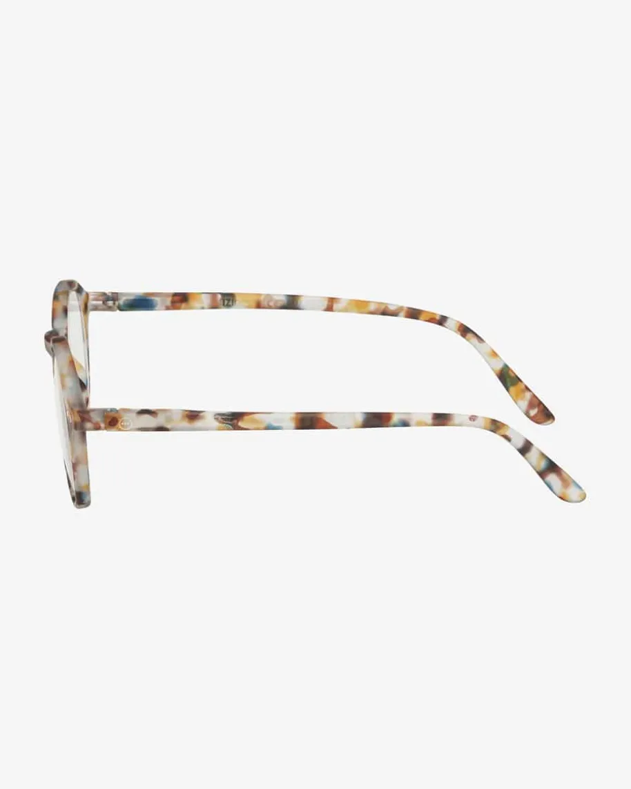 Lesebrille von Izipizi in Hellblau und Braun. Fashionable Reading – FlexibleBügel, besonders leichtes Gewicht und eine angesagte runde Rahmen-Form mitmodischem Farbton machen die limitierte Lesebrille zu einem funktionellen undzugleich stilvollen Accessoire. Eine im Lieferumfang enthaltene Filz-Hülle mitLogo-Schriftzug schützt die Brille der Collection #D.