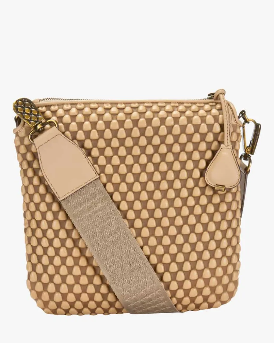 Liberty Umhängetasche für Damen von Tissa Fontaneda in Camel. Das 2010gegründete Label vereint Handwerkliches Können und Liebe zum Detail. Die soforterkennbare „Bubble Bag“ ist zum Markenzeichen der Kollektion Tissa Fontanedageworden. Auch dieses Modell begeistert in charakteristischer Aufmachung mitstrukturierter Optik, während der breite Schulterriemen sportive Akzente setzt.