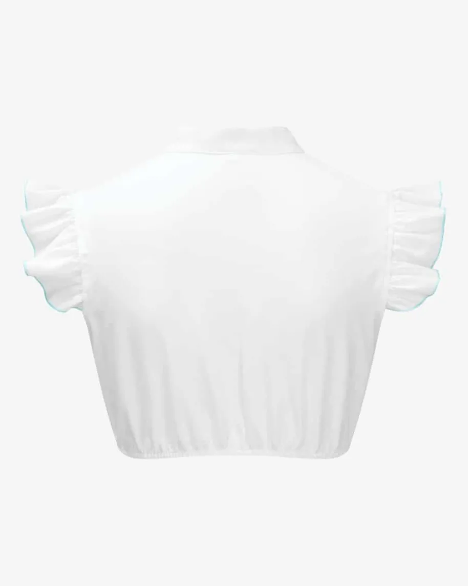 Lilly Dirndlbluse für Damen von Nicoletta Giacomelli in Weiß und Türkis. DieKreationen des Labels verbinden Tradition und Moderne und glänzen durch Eleganzund Raffinesse. Auch dieses Modell präsentiert sich dank angenehmem Baumwoll-Mixin traditioneller Aufmachung. Feminine Flügelärmel mit farbig abgesetzter Nahtsowie der schmale Stehkragen vervollständigen das Trachten-Design gekonnt.